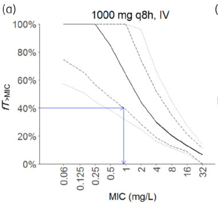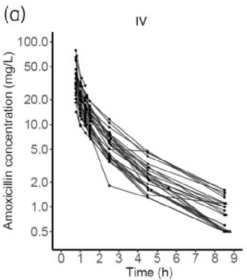 For amoxicillin IV administration, Cmax and the most of the time-concentration profiles look similar. However, for a lot of the simulated “patients” concentrations decrease quicker or to lower values than the real patient’s of the article.