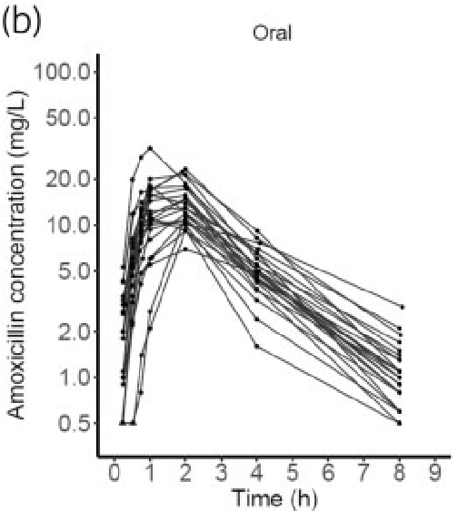 For amoxicillin oral administration, Tmax and Cmax of our simulations and the original article looks the same and overall profile seems similar. However, like for IV administration, some simulated patients’ concentrations decrease more and quicker than the real patients’.