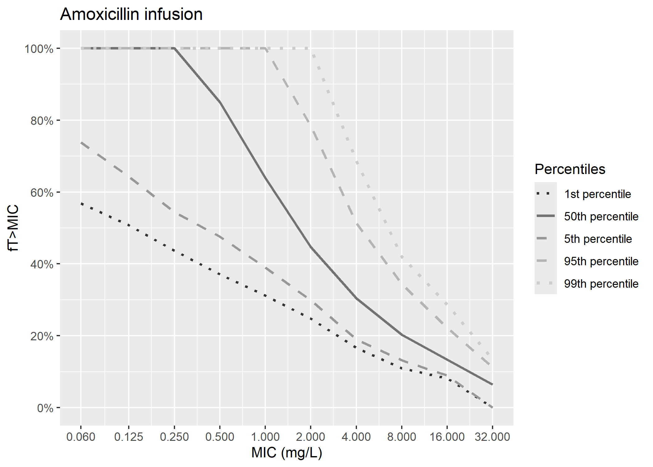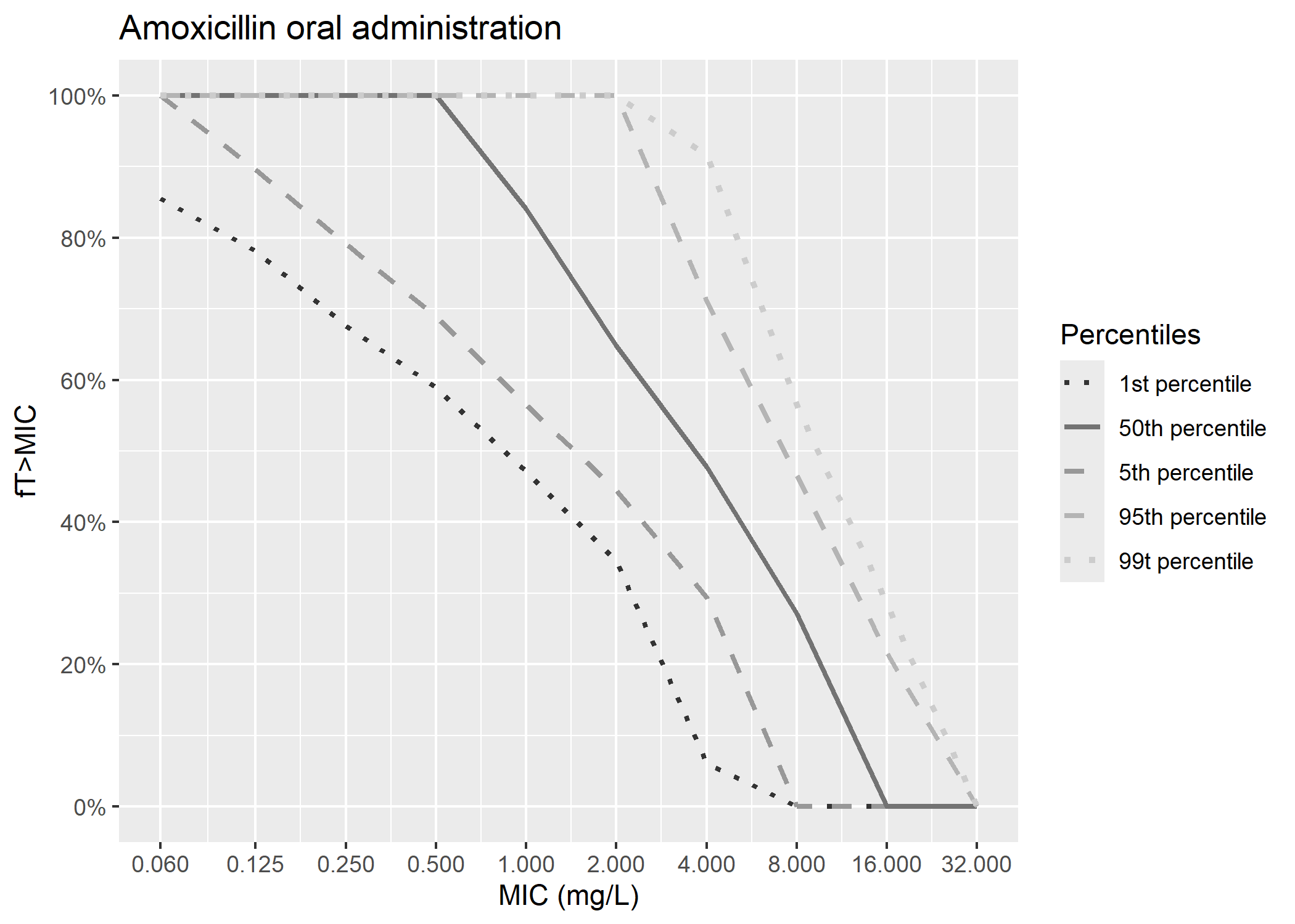 According to the article, amoxicillin plasmatic concentration measurements were done before administration and 15, 30, 45, 60, 120, 240 and 480 minutes after. Given these facts and figure 3, it looks like 5 bins were done to compute VPCs for amoxicillin oral administration : between 15 and 30 minutes, between 45 and 60 minutes, at 2, 4 and 8 hours. We tried to reproduce that binning.