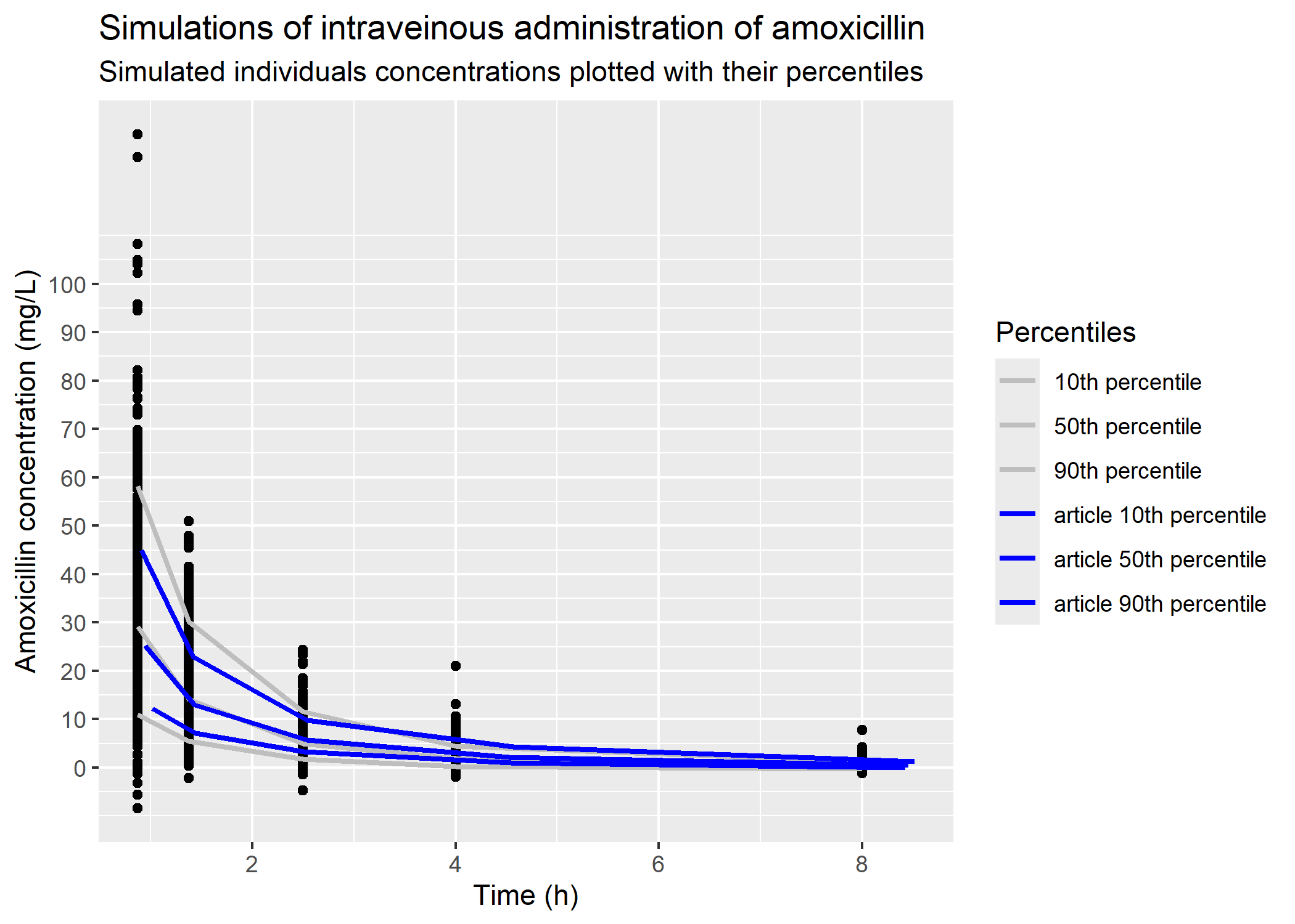 # article datafig_3a_10_percentile = readr::read_csv(here::here("Model_implementation_validation/data/mellon_hammas_2020/fig_article/percentiles_simulation/fig_3_a_p10th_sim.csv"), show_col_types = F) fig_3a_50_percentile = readr::read_csv(here::here("Model_implementation_validation/data/mellon_hammas_2020/fig_article/percentiles_simulation/fig_3_a_p50th_sim.csv"), show_col_types = F) fig_3a_90_percentile = readr::read_csv(here::here("Model_implementation_validation/data/mellon_hammas_2020/fig_article/percentiles_simulation/fig_3_a_p90th_sim.csv"), show_col_types = F) # plotplot_sim_iv_500_patients_points_2 = sim_iv_500_patients_for_plot_2 |> dplyr::summarise(.by = time,q10 =quantile(Y, 0.10),q50 =quantile(Y, 0.5),q90 =quantile(Y, 0.90) ) |> ggplot2::ggplot() + ggplot2::geom_point(data = sim_iv_500_patients_for_plot_2, mapping = ggplot2::aes(x = time, y = Y)) + ggplot2::geom_line(mapping = ggplot2::aes(x = time, y = q10, color ="10th percentile"), linewidth =1) + ggplot2::geom_line(mapping = ggplot2::aes(x = time, y = q50, color ="50th percentile"), linewidth =1) + ggplot2::geom_line(mapping = ggplot2::aes(x = time, y = q90, color ="90th percentile"), linewidth =1) + ggplot2::geom_line(data = fig_3a_10_percentile, mapping = ggplot2::aes(x = time, y = CP, color ="article 10th percentile"),linewidth =1) + ggplot2::geom_line(data = fig_3a_50_percentile, mapping = ggplot2::aes(x = time, y = CP, color ="article 50th percentile"),linewidth =1) + ggplot2::geom_line(data = fig_3a_90_percentile, mapping = ggplot2::aes(x = time, y = CP, color ="article 90th percentile"),linewidth =1) + ggplot2::scale_y_continuous(breaks =c(0, 10, 20, 30, 40, 50, 60, 70, 80, 90, 100)) + ggplot2::scale_color_manual(values =c("grey", "grey", "grey","blue", "blue", "blue")) + ggplot2::labs(title ="Simulations of intraveinous administration of amoxicillin", subtitle ="Simulated individuals concentrations plotted with their percentiles", colour ="Percentiles",x ="Time (h)",y ="Amoxicillin concentration (mg/L)") plot_sim_iv_500_patients_points_2