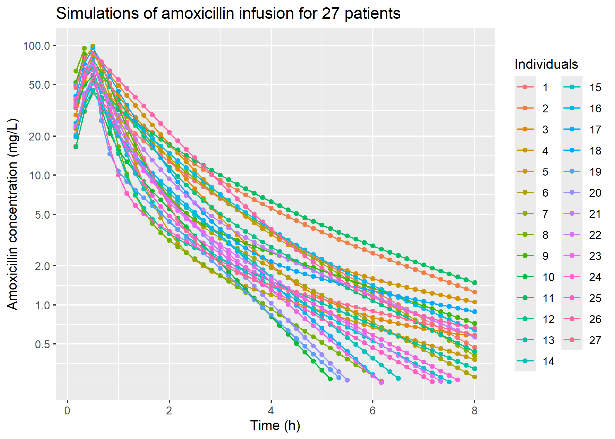 # plot IV administrationplot_iv_8h_27_patients = sim_iv_8h_27_patients |> dplyr::filter(time !=0) |> ggplot2::ggplot(mapping = ggplot2::aes(x = time, y = IPRED, color =as.factor(ID))) + ggplot2::geom_point() + ggplot2::geom_line() + ggplot2::scale_y_continuous(transform ="log2",breaks =c(0.5, 1, 2, 5, 10, 20, 50, 100),limits =c(0.25, 100)) + ggplot2::labs(title ="Simulations of amoxicillin infusion for 27 patients",color ="Individuals",y ="Amoxicillin concentration (mg/L)",x ="Time (h)")plot_iv_8h_27_patients