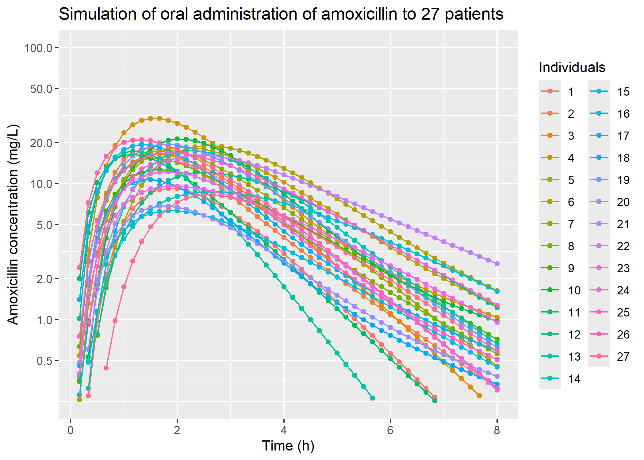 # plot oral administration: plot_oral_8h_27_patients = sim_oral_8h_27_patients |> dplyr::filter(time !=0) |> ggplot2::ggplot(mapping = ggplot2::aes(x = time, y = IPRED, color =as.factor(ID))) + ggplot2::geom_point() + ggplot2::geom_line() + ggplot2::scale_y_continuous(transform ="log2",breaks =c(0.5, 1, 2, 5, 10, 20, 50, 100),limits =c(0.25, 100)) + ggplot2::labs(title ="Simulation of oral administration of amoxicillin to 27 patients",color ="Individuals",y ="Amoxicillin concentration (mg/L)",x ="Time (h)")plot_oral_8h_27_patients