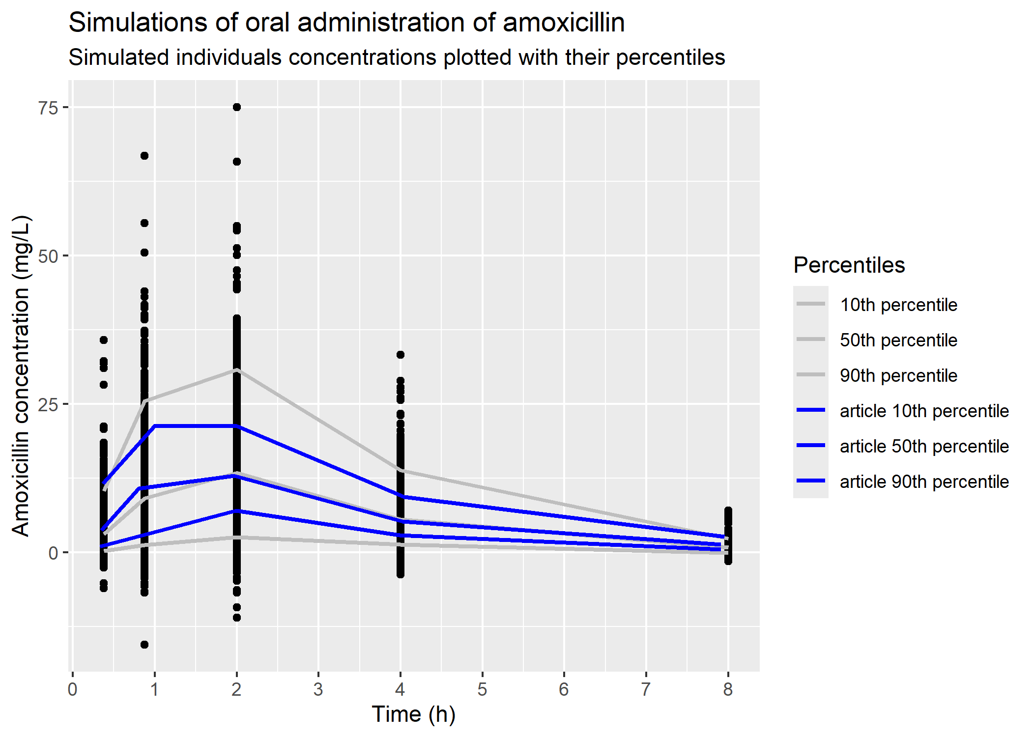 # oral administration# article datafig_3b_10_percentile = readr::read_csv(here::here("Model_implementation_validation/data/mellon_hammas_2020/fig_article/percentiles_simulation/fig_3_b_p10th_sim.csv"), show_col_types = F) fig_3b_50_percentile = readr::read_csv(here::here("Model_implementation_validation/data/mellon_hammas_2020/fig_article/percentiles_simulation/fig_3_b_p50th_sim.csv")) fig_3b_90_percentile = readr::read_csv(here::here("Model_implementation_validation/data/mellon_hammas_2020/fig_article/percentiles_simulation/fig_3_b_p90th_sim.csv"), show_col_types = F) # plotplot_sim_oral_500_patients_points = sim_oral_500_patients_for_plot |> dplyr::summarise(.by = time,q10 =quantile(Y, 0.10),q50 =quantile(Y, 0.5),q90 =quantile(Y, 0.90) ) |> ggplot2::ggplot() + ggplot2::geom_point(data = sim_oral_500_patients_for_plot, mapping = ggplot2::aes(x = time, y = Y)) + ggplot2::geom_line(mapping = ggplot2::aes(x = time, y = q10, color ="10th percentile"), linewidth =1) + ggplot2::geom_line(mapping = ggplot2::aes(x = time, y = q50, color ="50th percentile"), linewidth =1) + ggplot2::geom_line(mapping = ggplot2::aes(x = time, y = q90, color ="90th percentile"), linewidth =1) + ggplot2::geom_line(data = fig_3b_10_percentile, mapping = ggplot2::aes(x = time, y = CP, color ="article 10th percentile"),linewidth =1) + ggplot2::geom_line(data = fig_3b_50_percentile, mapping = ggplot2::aes(x = time, y = CP, color ="article 50th percentile"),linewidth =1) + ggplot2::geom_line(data = fig_3b_90_percentile, mapping = ggplot2::aes(x = time, y = CP, color ="article 90th percentile"),linewidth =1) + ggplot2::scale_color_manual(values =c("grey", "grey", "grey","blue", "blue", "blue")) + ggplot2::scale_x_continuous(breaks =c(0, 1, 2, 3, 4, 5, 6, 7, 8, 9)) + ggplot2::labs(title ="Simulations of oral administration of amoxicillin", subtitle ="Simulated individuals concentrations plotted with their percentiles", colour ="Percentiles",x ="Time (h)",y ="Amoxicillin concentration (mg/L)")plot_sim_oral_500_patients_points