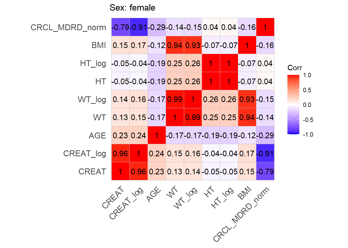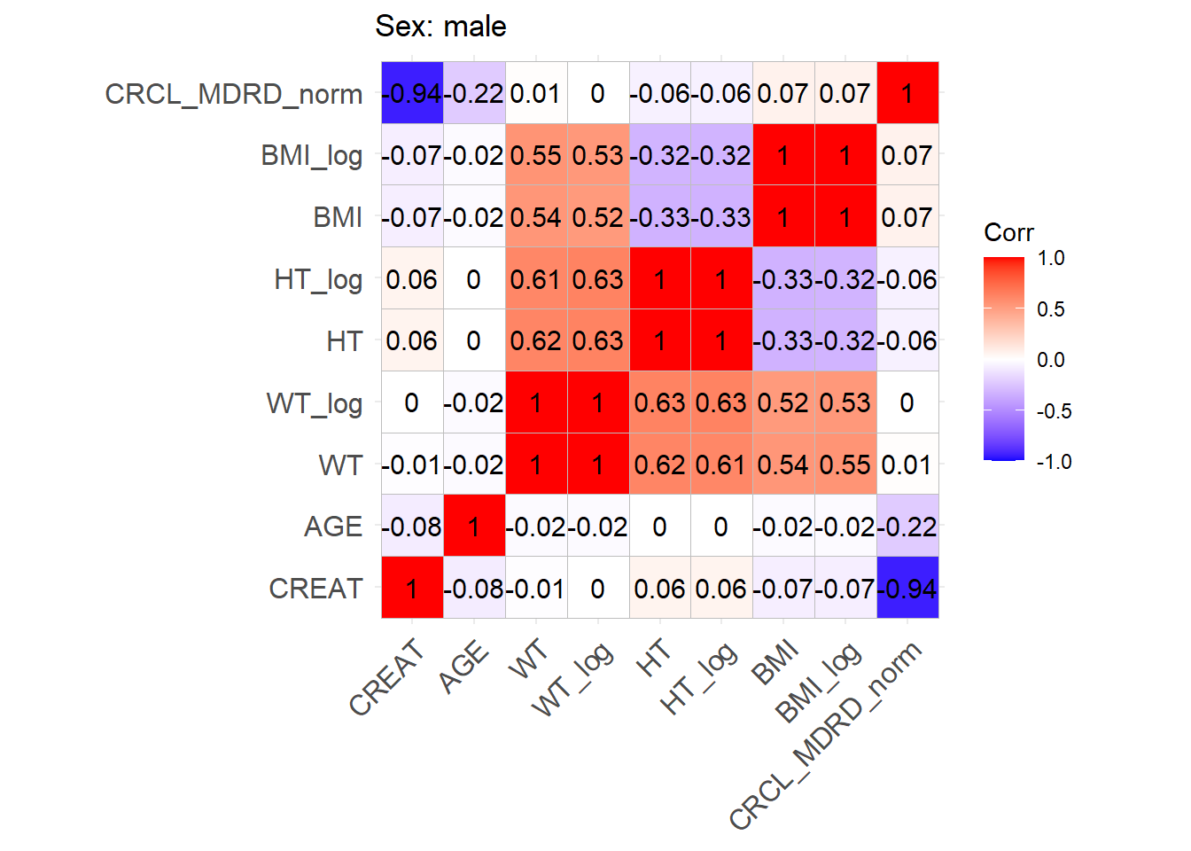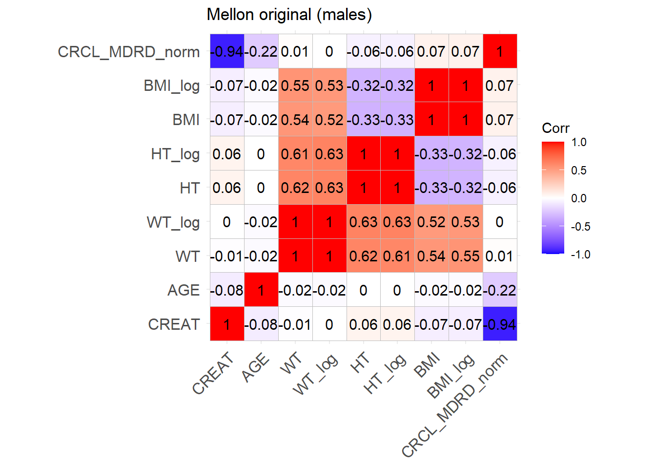 One issue with the covariate data reported in these papers is that correlations between covariates are not reported and simulating without correlations runs the risk of simulating improbable covariate values. We thus obtained a clinical dataset composed of more than 16000 ICU patients (Johnson et al. (2023)) from which we could derive correlations between covariates of interest. Age, serum creatinine, body weight, sex, height and BMI were obtained for these patients and the creatinine clearance was calculated (in mL/min for Cockroft and Gault and CKD-EPI and in mL/min/1.73 m2 for MDRD (to correspond to Mellon)). A correlation matrix was calculated for each of the respective model development cohorts separately for females and males.