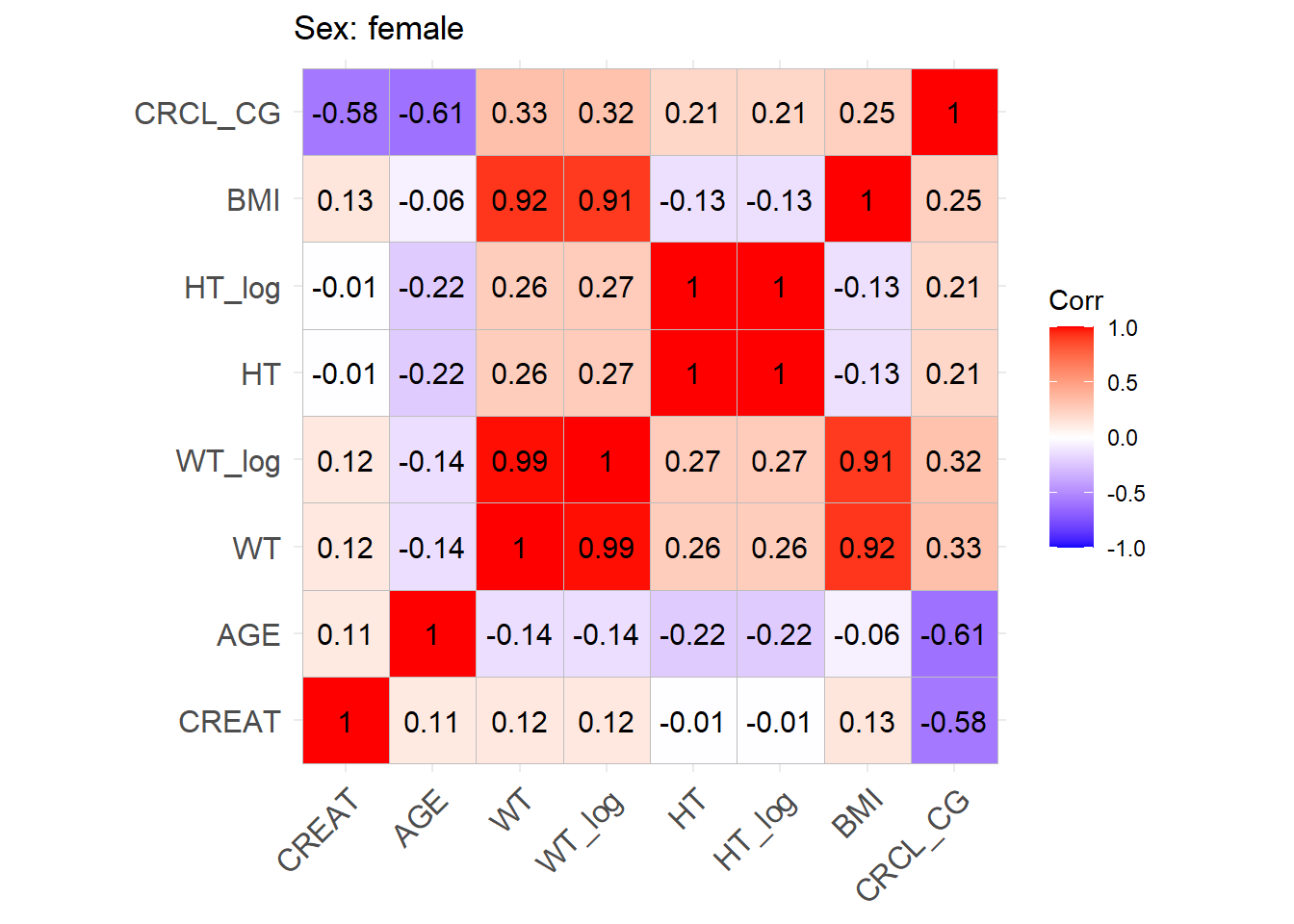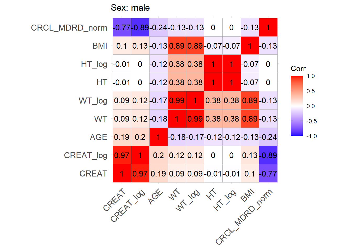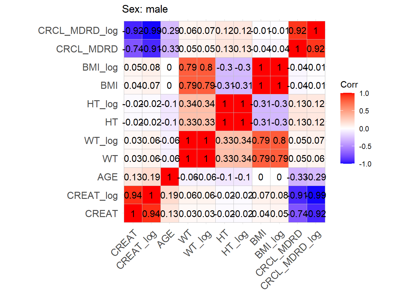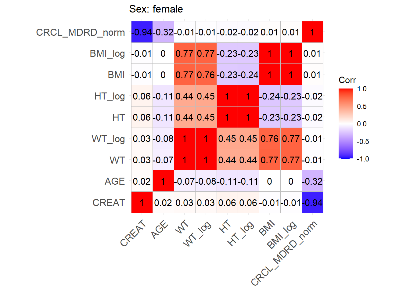 One issue with the covariate data reported in these papers is that correlations between covariates are not reported and simulating without correlations runs the risk of simulating improbable covariate values. We thus obtained a clinical dataset composed of more than 16000 ICU patients (Johnson et al. (2023)) from which we could derive correlations between covariates of interest. Age, serum creatinine, body weight, sex, height and BMI were obtained for these patients and the creatinine clearance was calculated (in mL/min for Cockroft and Gault and CKD-EPI and in mL/min/1.73 m2 for MDRD (to correspond to Mellon)). A correlation matrix was calculated for each of the respective model development cohorts separately for females and males.