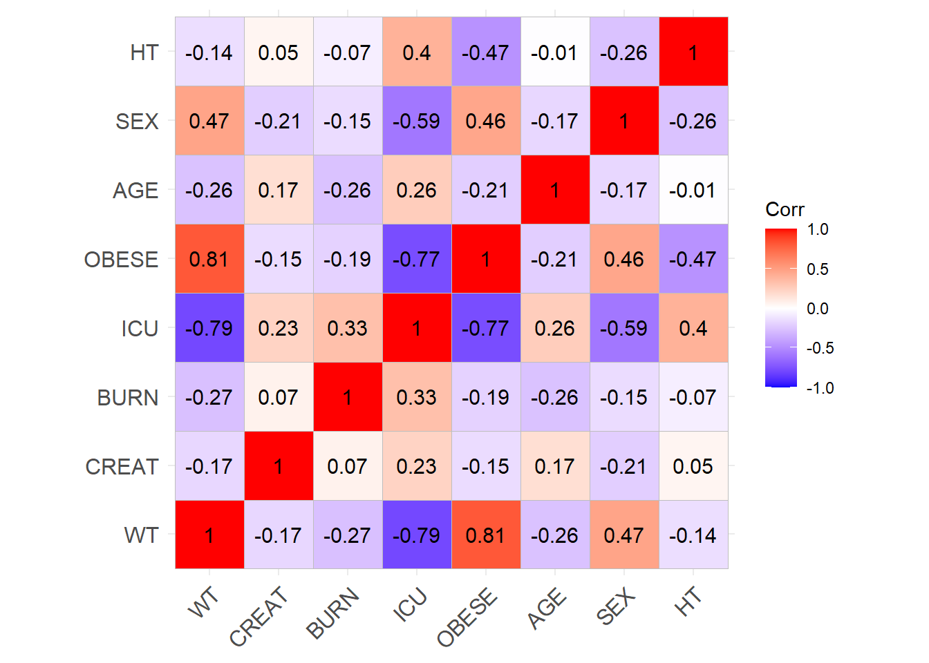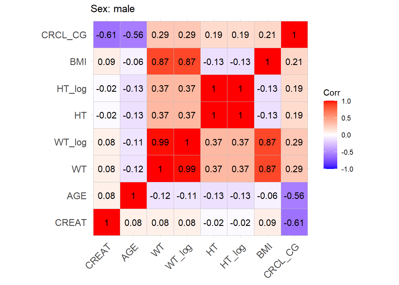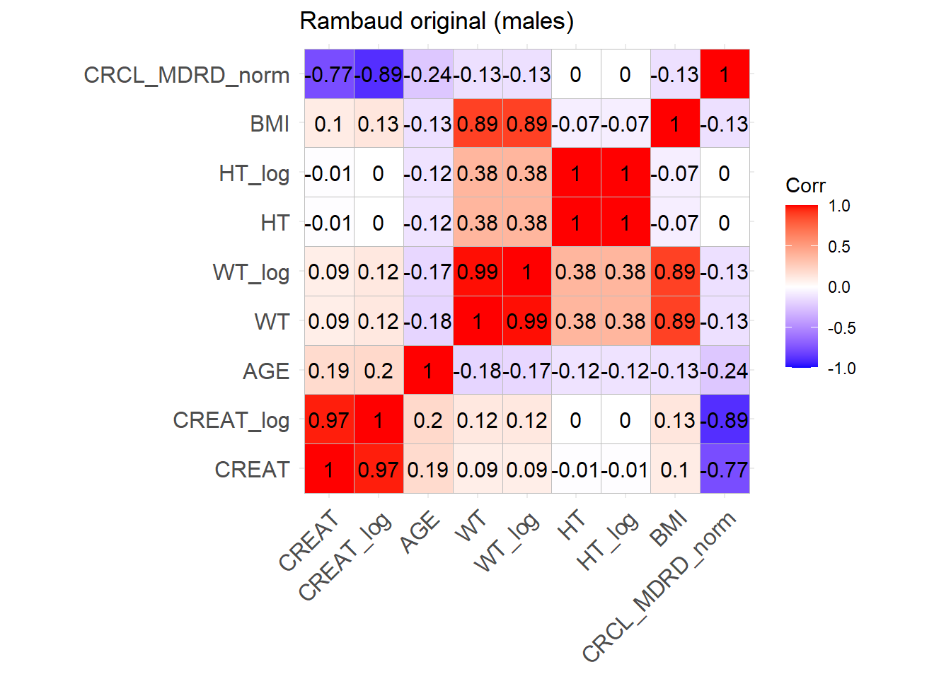 # Patchwork simulated correlation plotscorr_simulated <- (Carlier_F + Fournier_F + Mellon_F + Rambaud_F + Carlier_M + Fournier_M + Mellon_M + Rambaud_M) +plot_layout(ncol =4, nrow =2, byrow =TRUE)ggsave(filename =here("Figures/S5.jpg"),plot = corr_simulated,width =14, height =8, dpi =300)# Row-bind the datasets to have 25 subjects from each in a sample of 100datasets <-list(sim_cov_carlier, sim_cov_fournier, sim_cov_mellon, sim_cov_rambaud)interleave_rows <-function(datasets, chunk_size) { n_chunks <-nrow(datasets[[1]]) / chunk_size interleaved <-do.call(rbind, lapply(1:n_chunks, function(i) {do.call(rbind, lapply(datasets, function(dataset) { dataset[((i -1) * chunk_size +1):(i * chunk_size), ] })) }))return(interleaved)}COV <-interleave_rows(datasets, chunk_size =25)# Convert Paper column to MODEL_COHORT column which indicates the model that is used to simulated the covariatesCOV <- COV %>%mutate(MODEL_COHORT =case_when( Paper =="Carlier_2013"~"CARLIER", Paper =="Fournier_2018"~"FOURNIER", Paper =="Mellon_2020"~"MELLON", Paper =="Rambaud_2020"~"RAMBAUD") )# Adding IDCOV$ID <-seq(1:2500)# CRCL calculation functionscalculate_MDRD <-function(AGE, CREAT, SEX) {# Mutliply by 0.742 for females sex_factor <-ifelse(SEX ==0, 1, 0.742) eGFR <-175* (CREAT^(-1.154)) * AGE^(-0.203) * sex_factorreturn(eGFR)}calculate_CG <-function(AGE, CREAT, SEX, WT) { sex_factor <-ifelse(SEX ==0, 1, 0.85) eGFR <- ((140- AGE) * WT * sex_factor) / (CREAT *72)return(eGFR)}# Add 1 for dose adjustement for CRCL < 30 mL/min for Carlier and FournierCOV <- COV %>%rowwise() %>%mutate(CRCL =case_when( MODEL_COHORT =="CARLIER"~calculate_MDRD(AGE, CREAT, SEX) * (BSA /1.73), MODEL_COHORT =="FOURNIER"~calculate_CG(AGE, CREAT, SEX, WT),TRUE~NA_real_ ),IR =case_when( MODEL_COHORT =="CARLIER"& CRCL <30~1, MODEL_COHORT =="FOURNIER"& CRCL <30~1, MODEL_COHORT %in%c("MELLON", "RAMBAUD") ~0,TRUE~0 ) ) %>%ungroup()COV <- COV %>% dplyr::select(ID, MODEL_COHORT, WT, CREAT, BURN, ICU, OBESE, BSA, AGE, SEX, HT, IR)# Export to csvwrite.csv(COV, here("Data/COV.csv"), quote = F, row.names = F)# Check correlation (Pearson)cor_sim <-cor(COV %>% dplyr::select(WT, CREAT, BURN, ICU, OBESE, AGE, SEX, HT), use ="complete.obs")ggcorrplot(cor_sim, lab =TRUE)