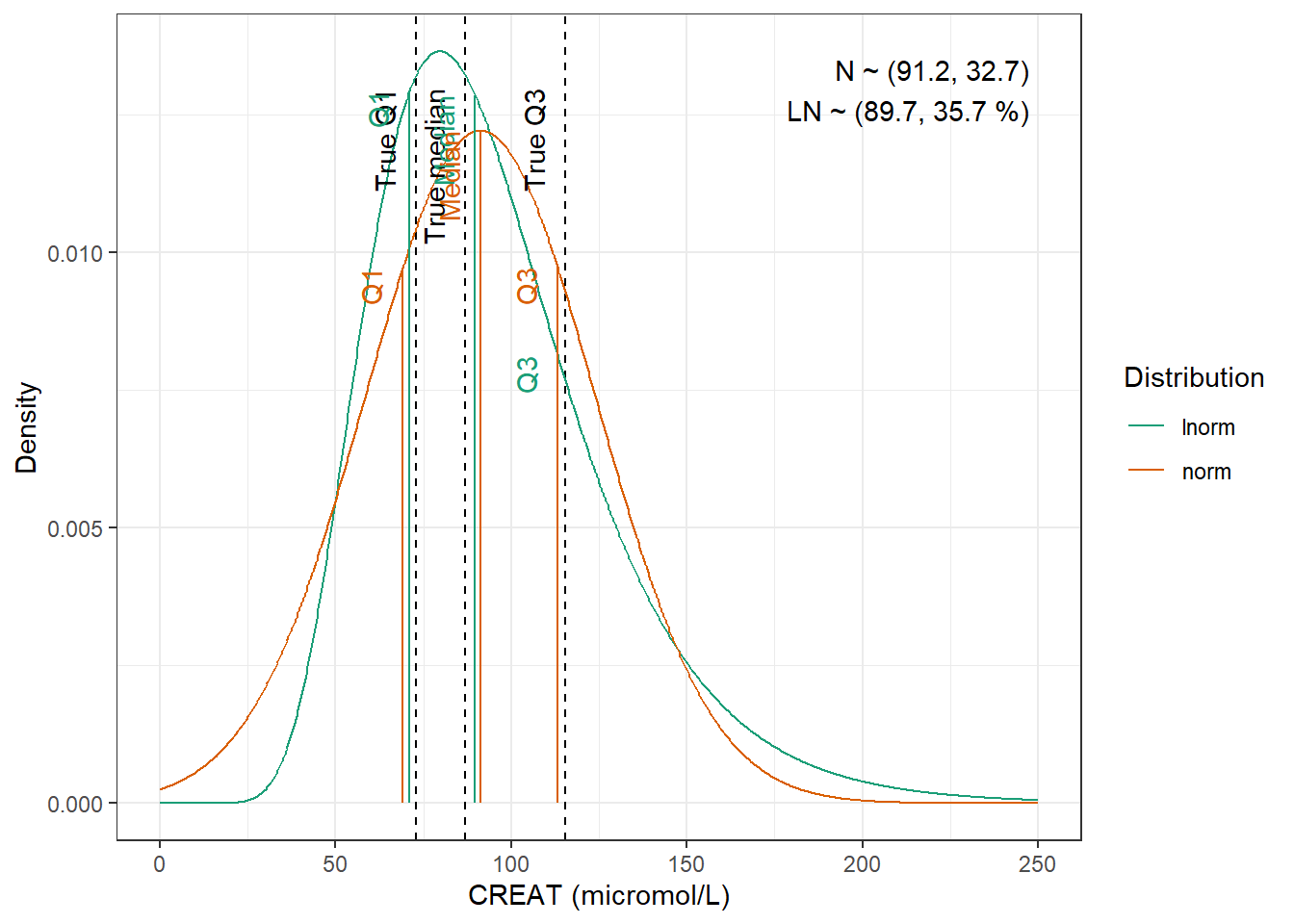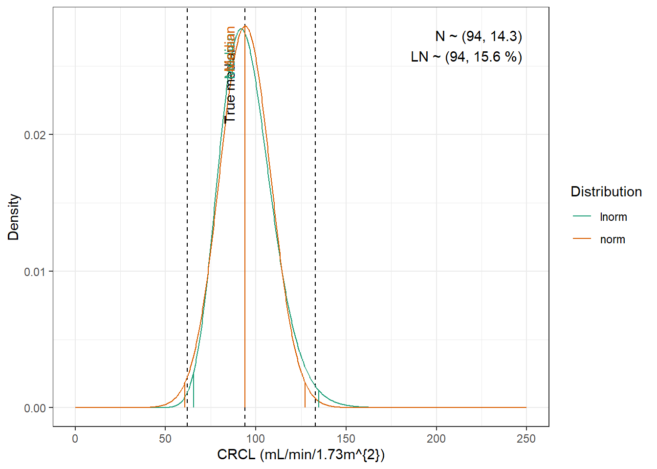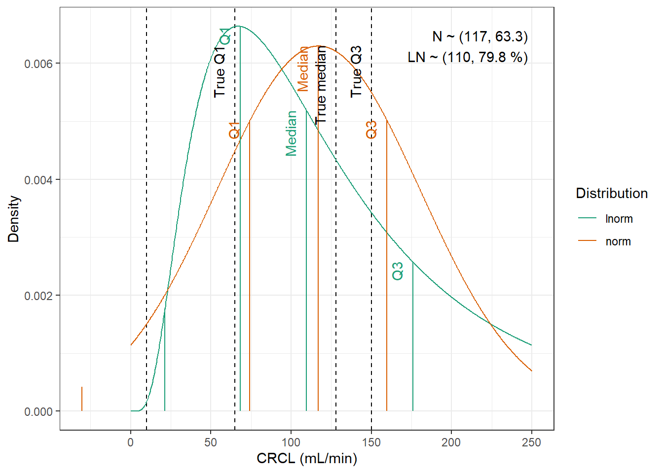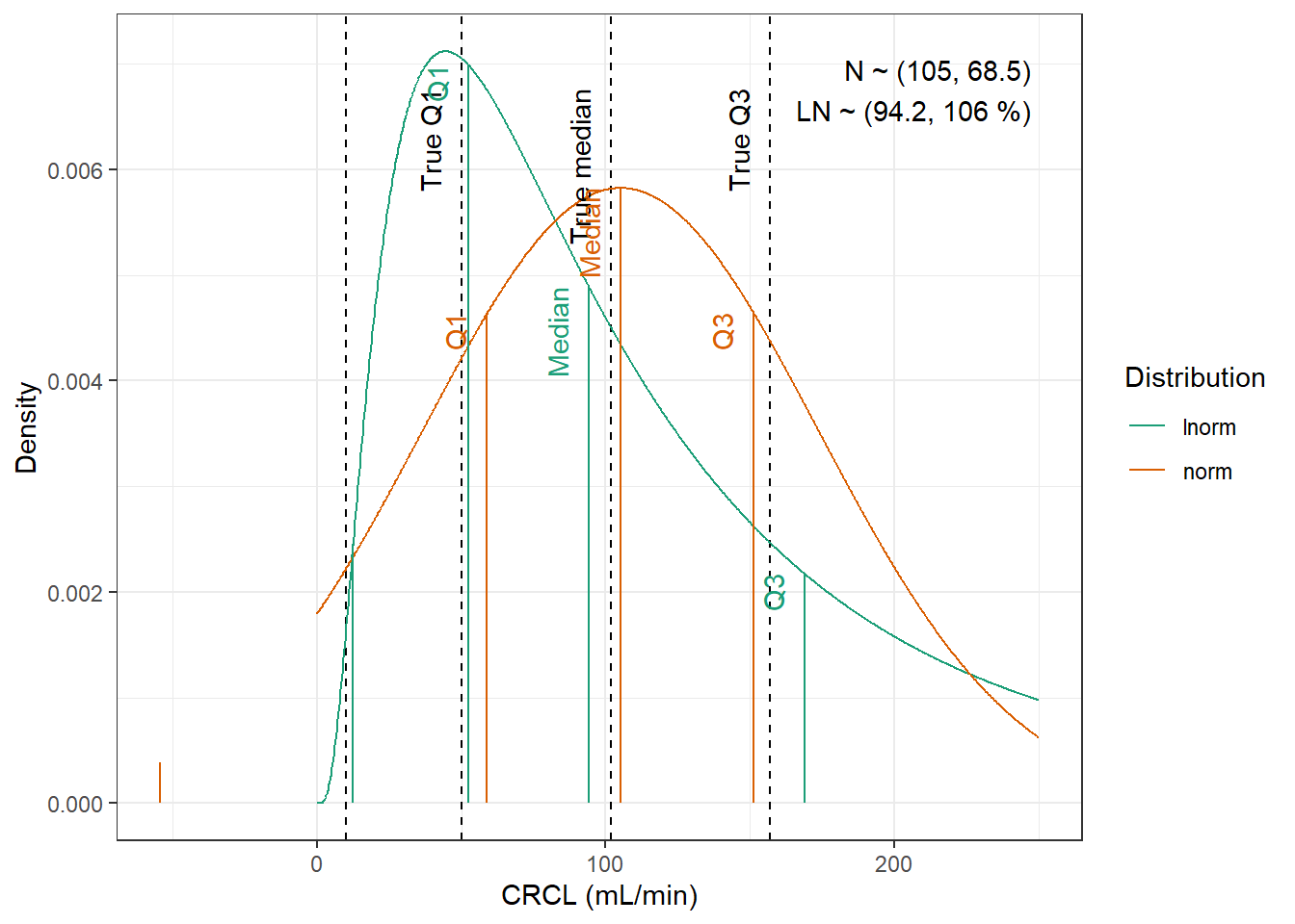 compute_cv_from_sd_lnorm <-function(sdlog){#' Compute the geometric coefficient of variation from the standard deviation of a lognormal distribution#'#' @param sdlog numeric. standard deviation of the log transformed variable#' #' @return numeric. geometric coefficient of variationsqrt(exp(sdlog^2)-1)}extract_cov_param <-function(cov_data, cov_name) {#' Get covariate quantiles from covariate characteristics table#'#' @param cov_data tibble containing the covariate information#' @param cov_name character. name of the covariate to select, comes from the Covariate column of cov_data.#' @return list with :#' - p : numeric vector of probabilities#' - q : numeric vector of quantiles#' - cov_name : character string containing the covariate name#' - cov_unit : character string containing the unit of the covariate cov_filtered_df <- cov_data |>filter(Covariate == cov_name) |>pivot_longer(cols =c(Median, Q1, Q3, Min, Max), # if the format of the csv columns ever changes, this will need to changenames_to ="p",values_to ="q" ) |>mutate(p =case_match(p, "Median"~0.5, "Q1"~0.25, "Q3"~0.75, "Min"~0.01, "Max"~0.99)) |># if the format of the csv columns ever changes, the code above will need to changefilter(!is.na(q)) |>group_by(Paper) |>arrange(p, .by_group =TRUE) |>ungroup()list(p = cov_filtered_df$p,q = cov_filtered_df$q,cov_name =unique(cov_filtered_df$Covariate),cov_unit =unique(cov_filtered_df$Unit) )}evaluate_distrib <-function(p, q, cov_name, cov_unit, min_plot, max_plot,tol =0.001) {#' Fit normal and lognormal distribution to observed quantiles#' @param p numeric vector of probabilities#' @param q numeric vector of quantiles#' @param cov_name character string containing the covariate name#' @param cov_unit character string containing the unit of the covariate#' @param min_plot minimal value of the covariate for which the distribution should be plotted#' @param max_plot maximal value of the covariate for which the distribution should be plotted#' @param tol numeric. tolerance value for the fitting algorithm, default is 0.001#' @return list with :#' - plot : ggplot2 showing the fitted distributions and the observed covariate#' - lnorm_par : named numeric vector with the lognormal distribution parameters#' - norm_par : named numeric vector with the normal distribution parameters lnorm_par <-get.lnorm.par(p = p, q = q, plot =FALSE, show.output =FALSE,tol = tol) norm_par <-get.norm.par(p = p, q = q, plot =FALSE, show.output =FALSE,tol=tol)#create a dataset with the true percentiles to be able to show them on the plot true_percentiles <-tibble(p, q) |>mutate(label =case_match(p, 0~"True min",0.25~"True Q1",0.5~"True median",0.75~"True Q3",1~"True max")) #create a dataset with the percentiles of the fitted distributiosn to be able to show them on the plot distrib_percentiles <-tibble(probability = p,lnorm =qlnorm(probability, meanlog = lnorm_par["meanlog"], sdlog = lnorm_par["sdlog"]),norm =qnorm(probability, mean = norm_par["mean"], sd = norm_par["sd"]) ) |>pivot_longer(cols =c(lnorm, norm), names_to ="distrib") |>mutate(density =case_match( distrib,"norm"~dnorm(value, mean = norm_par["mean"], sd = norm_par["sd"]),"lnorm"~dlnorm(value, meanlog = lnorm_par["meanlog"], sdlog = lnorm_par["sdlog"]) )) |>mutate(label =case_match(probability, 0~"Min",0.25~"Q1",0.5~"Median",0.75~"Q3",1~"Max")) #simulate 1000 datapoints from the fitted distributions to show on the plot param_data <-tibble(variable =seq(min_plot, max_plot, length.out =1000),lnorm =dlnorm(variable, meanlog = lnorm_par["meanlog"], sdlog = lnorm_par["sdlog"]),norm =dnorm(variable, mean = norm_par["mean"], sd = norm_par["sd"]) ) |>pivot_longer(cols =c(lnorm, norm), names_to ="distrib") plot <-ggplot(param_data, aes(x = variable, y = value, color = distrib)) +geom_vline(data = true_percentiles, mapping =aes(xintercept = q),lty ="dashed") +geom_line() +geom_segment(data = distrib_percentiles, aes(x = value, y =0, yend = density)) +theme_bw() +scale_color_brewer("Distribution", palette ="Dark2") +ylab("Density") +xlab(paste0(cov_name, " (", cov_unit, ")")) +annotate(geom ="text",label =paste0("N ~ (",signif(norm_par["mean"], 3),", ",signif(norm_par["sd"], 3),")\n","LN ~ (",signif(exp(lnorm_par["meanlog"]), 3),", ",signif(compute_cv_from_sd_lnorm(lnorm_par["sdlog"]), 3) *100," %)" ),x =min(param_data$variable) +0.99*diff(range(param_data$variable)),y =min(param_data$value) +0.99*diff(range(param_data$value)),hjust =1,vjust =1 )+geom_text(data = true_percentiles,mapping =aes(x = q,label = label,color=NULL),show.legend =FALSE,y =min(param_data$value) +0.95*diff(range(param_data$value)),hjust =1,vjust =-1,angle =90 )+geom_text(data = distrib_percentiles,mapping =aes(x = value, y=density,label = label),show.legend =FALSE,hjust =1,vjust =-1,angle =90 )list(plot = plot,lnorm_par = lnorm_par,norm_par = norm_par)}fit_cov_wrapper <-function(cov_data, cov_name, min_plot, max_plot, tol =0.001) {#' Wrapper to get covariate quantiles from covariate characteristics table and fit normal and lognormal distribution#' to observed quantiles #'#' @param cov_data tibble containing the covariate information#' @param cov_name character. name of the covariate to select, comes from the Covariate column of cov_data.#' @param min_plot minimal value of the covariate for which the distribution should be plotted#' @param max_plot maximal value of the covariate for which the distribution should be plotted#' @param tol numeric. tolerance value for the fitting algorithm, default is 0.001#' @return list with :#' - plot : ggplot2 showing the fitted distributions and the observed covariate#' - lnorm_par : named numeric vector with the lognormal distribution parameters#' - norm_par : named numeric vector with the normal distribution parameters cov_df <-extract_cov_param(cov_data, cov_name)evaluate_distrib(p = cov_df$p,q = cov_df$q,min_plot = min_plot,max_plot = max_plot,cov_name = cov_df$cov_name,cov_unit = cov_df$cov_unit,tol = tol )}