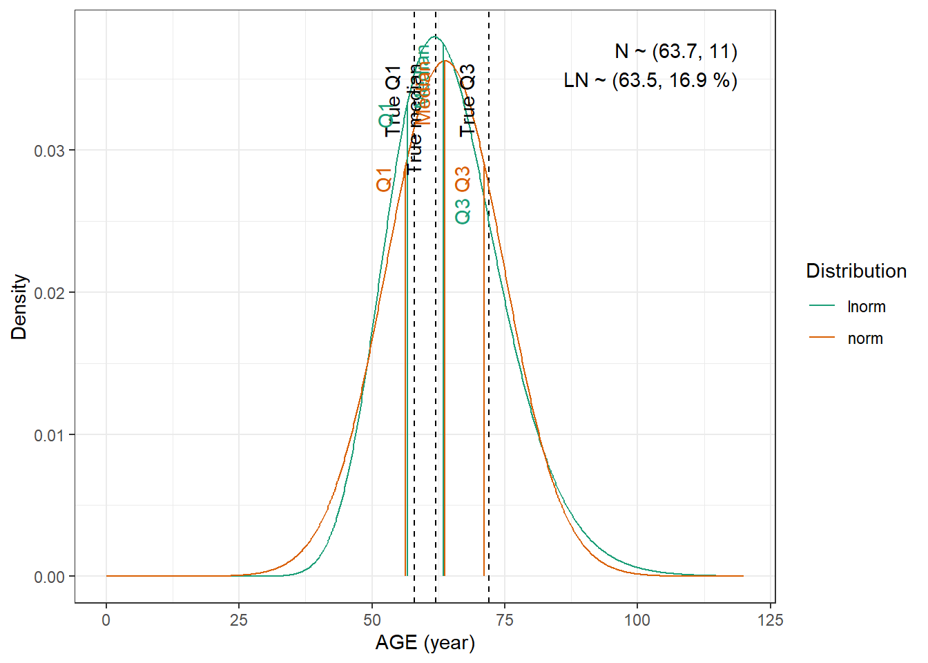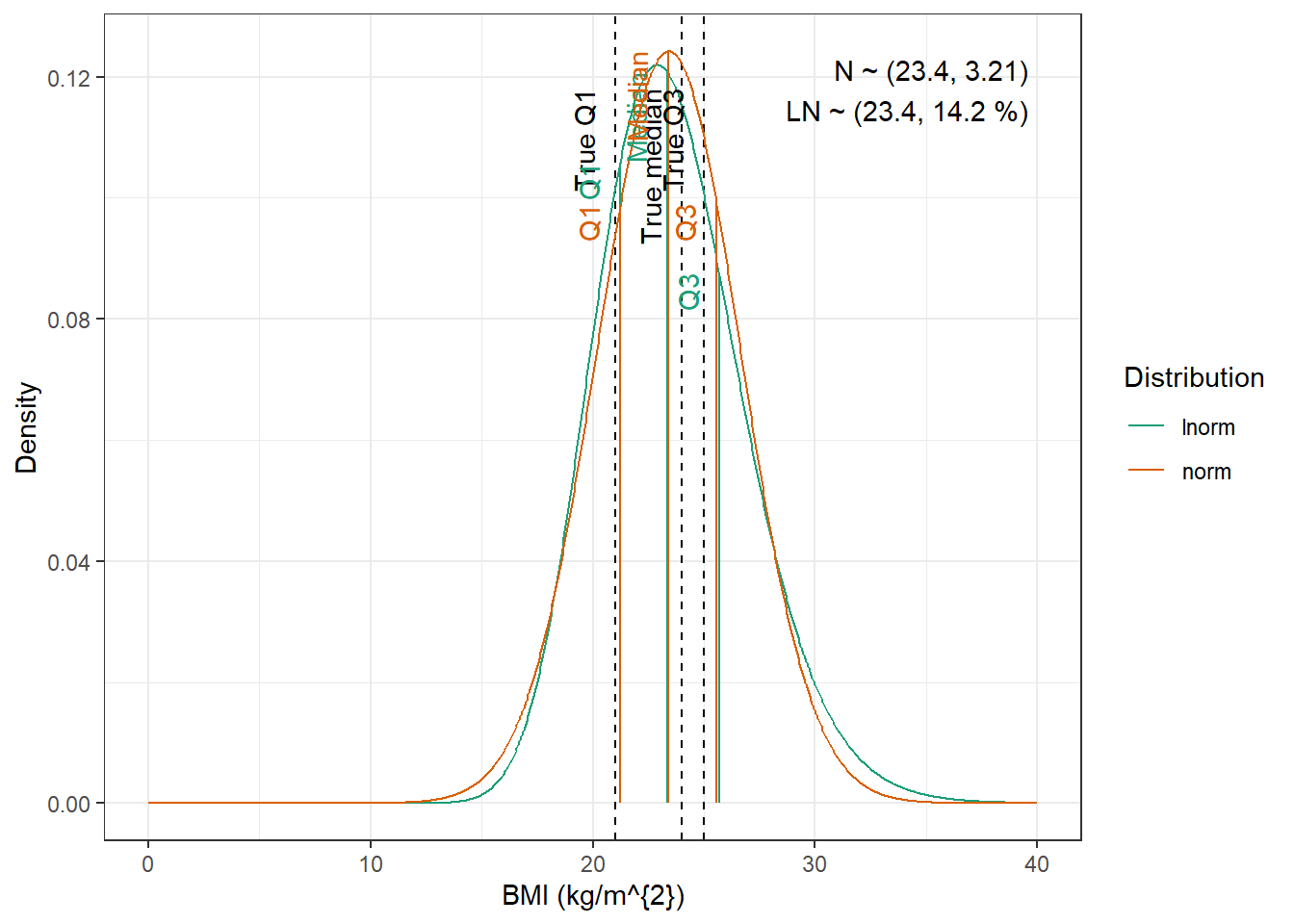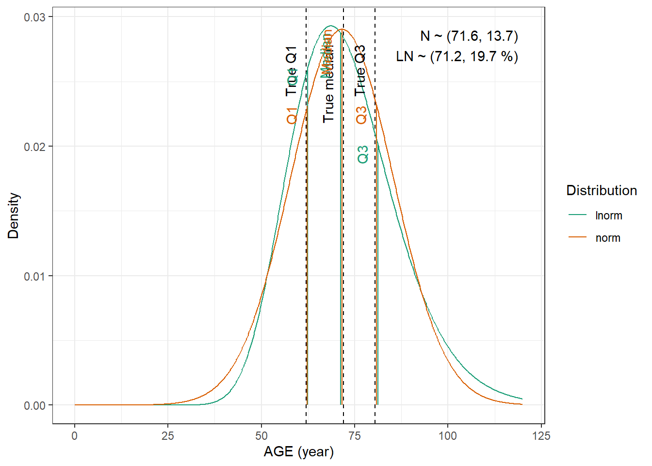 compute_cv_from_sd_lnorm <-function(sdlog){#' Compute the geometric coefficient of variation from the standard deviation of a lognormal distribution#'#' @param sdlog numeric. standard deviation of the log transformed variable#' #' @return numeric. geometric coefficient of variationsqrt(exp(sdlog^2)-1)}extract_cov_param <-function(cov_data, cov_name) {#' Get covariate quantiles from covariate characteristics table#'#' @param cov_data tibble containing the covariate information#' @param cov_name character. name of the covariate to select, comes from the Covariate column of cov_data.#' @return list with :#' - p : numeric vector of probabilities#' - q : numeric vector of quantiles#' - cov_name : character string containing the covariate name#' - cov_unit : character string containing the unit of the covariate cov_filtered_df <- cov_data |>filter(Covariate == cov_name) |>pivot_longer(cols =c(Median, Q1, Q3, Min, Max), # if the format of the csv columns ever changes, this will need to changenames_to ="p",values_to ="q" ) |>mutate(p =case_match(p, "Median"~0.5, "Q1"~0.25, "Q3"~0.75, "Min"~0.01, "Max"~0.99)) |># if the format of the csv columns ever changes, the code above will need to changefilter(!is.na(q)) |>group_by(Paper) |>arrange(p, .by_group =TRUE) |>ungroup()list(p = cov_filtered_df$p,q = cov_filtered_df$q,cov_name =unique(cov_filtered_df$Covariate),cov_unit =unique(cov_filtered_df$Unit) )}evaluate_distrib <-function(p, q, cov_name, cov_unit, min_plot, max_plot,tol =0.001) {#' Fit normal and lognormal distribution to observed quantiles#' @param p numeric vector of probabilities#' @param q numeric vector of quantiles#' @param cov_name character string containing the covariate name#' @param cov_unit character string containing the unit of the covariate#' @param min_plot minimal value of the covariate for which the distribution should be plotted#' @param max_plot maximal value of the covariate for which the distribution should be plotted#' @param tol numeric. tolerance value for the fitting algorithm, default is 0.001#' @return list with :#' - plot : ggplot2 showing the fitted distributions and the observed covariate#' - lnorm_par : named numeric vector with the lognormal distribution parameters#' - norm_par : named numeric vector with the normal distribution parameters lnorm_par <-get.lnorm.par(p = p, q = q, plot =FALSE, show.output =FALSE,tol = tol) norm_par <-get.norm.par(p = p, q = q, plot =FALSE, show.output =FALSE,tol=tol)#create a dataset with the true percentiles to be able to show them on the plot true_percentiles <-tibble(p, q) |>mutate(label =case_match(p, 0~"True min",0.25~"True Q1",0.5~"True median",0.75~"True Q3",1~"True max")) #create a dataset with the percentiles of the fitted distributiosn to be able to show them on the plot distrib_percentiles <-tibble(probability = p,lnorm =qlnorm(probability, meanlog = lnorm_par["meanlog"], sdlog = lnorm_par["sdlog"]),norm =qnorm(probability, mean = norm_par["mean"], sd = norm_par["sd"]) ) |>pivot_longer(cols =c(lnorm, norm), names_to ="distrib") |>mutate(density =case_match( distrib,"norm"~dnorm(value, mean = norm_par["mean"], sd = norm_par["sd"]),"lnorm"~dlnorm(value, meanlog = lnorm_par["meanlog"], sdlog = lnorm_par["sdlog"]) )) |>mutate(label =case_match(probability, 0~"Min",0.25~"Q1",0.5~"Median",0.75~"Q3",1~"Max")) #simulate 1000 datapoints from the fitted distributions to show on the plot param_data <-tibble(variable =seq(min_plot, max_plot, length.out =1000),lnorm =dlnorm(variable, meanlog = lnorm_par["meanlog"], sdlog = lnorm_par["sdlog"]),norm =dnorm(variable, mean = norm_par["mean"], sd = norm_par["sd"]) ) |>pivot_longer(cols =c(lnorm, norm), names_to ="distrib") plot <-ggplot(param_data, aes(x = variable, y = value, color = distrib)) +geom_vline(data = true_percentiles, mapping =aes(xintercept = q),lty ="dashed") +geom_line() +geom_segment(data = distrib_percentiles, aes(x = value, y =0, yend = density)) +theme_bw() +scale_color_brewer("Distribution", palette ="Dark2") +ylab("Density") +xlab(paste0(cov_name, " (", cov_unit, ")")) +annotate(geom ="text",label =paste0("N ~ (",signif(norm_par["mean"], 3),", ",signif(norm_par["sd"], 3),")\n","LN ~ (",signif(exp(lnorm_par["meanlog"]), 3),", ",signif(compute_cv_from_sd_lnorm(lnorm_par["sdlog"]), 3) *100," %)" ),x =min(param_data$variable) +0.99*diff(range(param_data$variable)),y =min(param_data$value) +0.99*diff(range(param_data$value)),hjust =1,vjust =1 )+geom_text(data = true_percentiles,mapping =aes(x = q,label = label,color=NULL),show.legend =FALSE,y =min(param_data$value) +0.95*diff(range(param_data$value)),hjust =1,vjust =-1,angle =90 )+geom_text(data = distrib_percentiles,mapping =aes(x = value, y=density,label = label),show.legend =FALSE,hjust =1,vjust =-1,angle =90 )list(plot = plot,lnorm_par = lnorm_par,norm_par = norm_par)}fit_cov_wrapper <-function(cov_data, cov_name, min_plot, max_plot, tol =0.001) {#' Wrapper to get covariate quantiles from covariate characteristics table and fit normal and lognormal distribution#' to observed quantiles #'#' @param cov_data tibble containing the covariate information#' @param cov_name character. name of the covariate to select, comes from the Covariate column of cov_data.#' @param min_plot minimal value of the covariate for which the distribution should be plotted#' @param max_plot maximal value of the covariate for which the distribution should be plotted#' @param tol numeric. tolerance value for the fitting algorithm, default is 0.001#' @return list with :#' - plot : ggplot2 showing the fitted distributions and the observed covariate#' - lnorm_par : named numeric vector with the lognormal distribution parameters#' - norm_par : named numeric vector with the normal distribution parameters cov_df <-extract_cov_param(cov_data, cov_name)evaluate_distrib(p = cov_df$p,q = cov_df$q,min_plot = min_plot,max_plot = max_plot,cov_name = cov_df$cov_name,cov_unit = cov_df$cov_unit,tol = tol )}