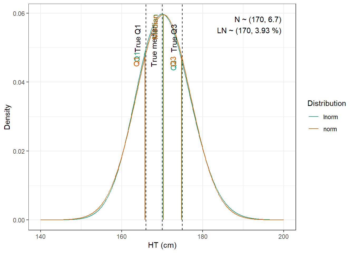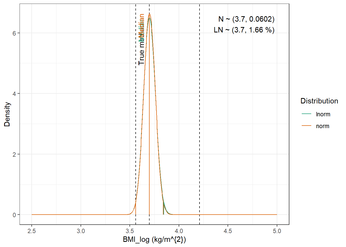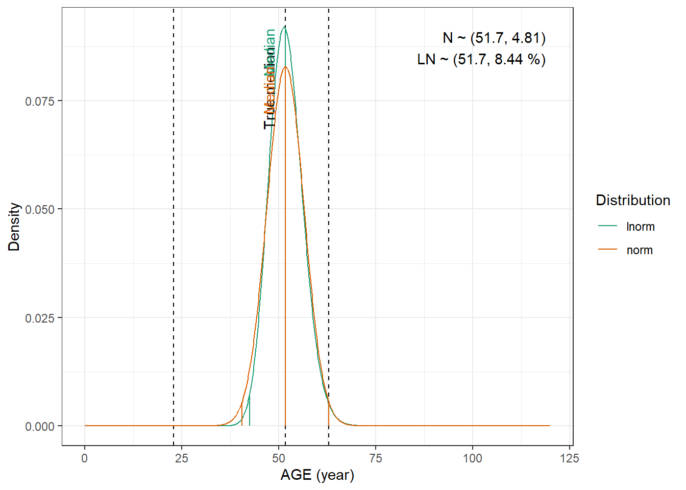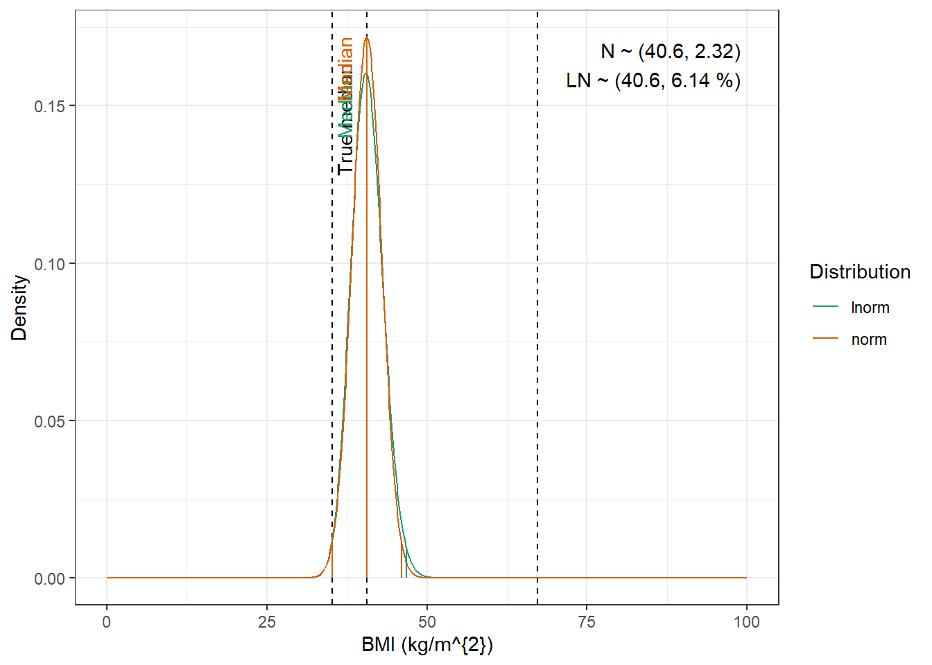 compute_cv_from_sd_lnorm <-function(sdlog){#' Compute the geometric coefficient of variation from the standard deviation of a lognormal distribution#'#' @param sdlog numeric. standard deviation of the log transformed variable#' #' @return numeric. geometric coefficient of variationsqrt(exp(sdlog^2)-1)}extract_cov_param <-function(cov_data, cov_name) {#' Get covariate quantiles from covariate characteristics table#'#' @param cov_data tibble containing the covariate information#' @param cov_name character. name of the covariate to select, comes from the Covariate column of cov_data.#' @return list with :#' - p : numeric vector of probabilities#' - q : numeric vector of quantiles#' - cov_name : character string containing the covariate name#' - cov_unit : character string containing the unit of the covariate cov_filtered_df <- cov_data |>filter(Covariate == cov_name) |>pivot_longer(cols =c(Median, Q1, Q3, Min, Max), # if the format of the csv columns ever changes, this will need to changenames_to ="p",values_to ="q" ) |>mutate(p =case_match(p, "Median"~0.5, "Q1"~0.25, "Q3"~0.75, "Min"~0.01, "Max"~0.99)) |># if the format of the csv columns ever changes, the code above will need to changefilter(!is.na(q)) |>group_by(Paper) |>arrange(p, .by_group =TRUE) |>ungroup()list(p = cov_filtered_df$p,q = cov_filtered_df$q,cov_name =unique(cov_filtered_df$Covariate),cov_unit =unique(cov_filtered_df$Unit) )}evaluate_distrib <-function(p, q, cov_name, cov_unit, min_plot, max_plot,tol =0.001) {#' Fit normal and lognormal distribution to observed quantiles#' @param p numeric vector of probabilities#' @param q numeric vector of quantiles#' @param cov_name character string containing the covariate name#' @param cov_unit character string containing the unit of the covariate#' @param min_plot minimal value of the covariate for which the distribution should be plotted#' @param max_plot maximal value of the covariate for which the distribution should be plotted#' @param tol numeric. tolerance value for the fitting algorithm, default is 0.001#' @return list with :#' - plot : ggplot2 showing the fitted distributions and the observed covariate#' - lnorm_par : named numeric vector with the lognormal distribution parameters#' - norm_par : named numeric vector with the normal distribution parameters lnorm_par <-get.lnorm.par(p = p, q = q, plot =FALSE, show.output =FALSE,tol = tol) norm_par <-get.norm.par(p = p, q = q, plot =FALSE, show.output =FALSE,tol=tol)#create a dataset with the true percentiles to be able to show them on the plot true_percentiles <-tibble(p, q) |>mutate(label =case_match(p, 0~"True min",0.25~"True Q1",0.5~"True median",0.75~"True Q3",1~"True max")) #create a dataset with the percentiles of the fitted distributiosn to be able to show them on the plot distrib_percentiles <-tibble(probability = p,lnorm =qlnorm(probability, meanlog = lnorm_par["meanlog"], sdlog = lnorm_par["sdlog"]),norm =qnorm(probability, mean = norm_par["mean"], sd = norm_par["sd"]) ) |>pivot_longer(cols =c(lnorm, norm), names_to ="distrib") |>mutate(density =case_match( distrib,"norm"~dnorm(value, mean = norm_par["mean"], sd = norm_par["sd"]),"lnorm"~dlnorm(value, meanlog = lnorm_par["meanlog"], sdlog = lnorm_par["sdlog"]) )) |>mutate(label =case_match(probability, 0~"Min",0.25~"Q1",0.5~"Median",0.75~"Q3",1~"Max")) #simulate 1000 datapoints from the fitted distributions to show on the plot param_data <-tibble(variable =seq(min_plot, max_plot, length.out =1000),lnorm =dlnorm(variable, meanlog = lnorm_par["meanlog"], sdlog = lnorm_par["sdlog"]),norm =dnorm(variable, mean = norm_par["mean"], sd = norm_par["sd"]) ) |>pivot_longer(cols =c(lnorm, norm), names_to ="distrib") plot <-ggplot(param_data, aes(x = variable, y = value, color = distrib)) +geom_vline(data = true_percentiles, mapping =aes(xintercept = q),lty ="dashed") +geom_line() +geom_segment(data = distrib_percentiles, aes(x = value, y =0, yend = density)) +theme_bw() +scale_color_brewer("Distribution", palette ="Dark2") +ylab("Density") +xlab(paste0(cov_name, " (", cov_unit, ")")) +annotate(geom ="text",label =paste0("N ~ (",signif(norm_par["mean"], 3),", ",signif(norm_par["sd"], 3),")\n","LN ~ (",signif(exp(lnorm_par["meanlog"]), 3),", ",signif(compute_cv_from_sd_lnorm(lnorm_par["sdlog"]), 3) *100," %)" ),x =min(param_data$variable) +0.99*diff(range(param_data$variable)),y =min(param_data$value) +0.99*diff(range(param_data$value)),hjust =1,vjust =1 )+geom_text(data = true_percentiles,mapping =aes(x = q,label = label,color=NULL),show.legend =FALSE,y =min(param_data$value) +0.95*diff(range(param_data$value)),hjust =1,vjust =-1,angle =90 )+geom_text(data = distrib_percentiles,mapping =aes(x = value, y=density,label = label),show.legend =FALSE,hjust =1,vjust =-1,angle =90 )list(plot = plot,lnorm_par = lnorm_par,norm_par = norm_par)}fit_cov_wrapper <-function(cov_data, cov_name, min_plot, max_plot, tol =0.001) {#' Wrapper to get covariate quantiles from covariate characteristics table and fit normal and lognormal distribution#' to observed quantiles #'#' @param cov_data tibble containing the covariate information#' @param cov_name character. name of the covariate to select, comes from the Covariate column of cov_data.#' @param min_plot minimal value of the covariate for which the distribution should be plotted#' @param max_plot maximal value of the covariate for which the distribution should be plotted#' @param tol numeric. tolerance value for the fitting algorithm, default is 0.001#' @return list with :#' - plot : ggplot2 showing the fitted distributions and the observed covariate#' - lnorm_par : named numeric vector with the lognormal distribution parameters#' - norm_par : named numeric vector with the normal distribution parameters cov_df <-extract_cov_param(cov_data, cov_name)evaluate_distrib(p = cov_df$p,q = cov_df$q,min_plot = min_plot,max_plot = max_plot,cov_name = cov_df$cov_name,cov_unit = cov_df$cov_unit,tol = tol )}