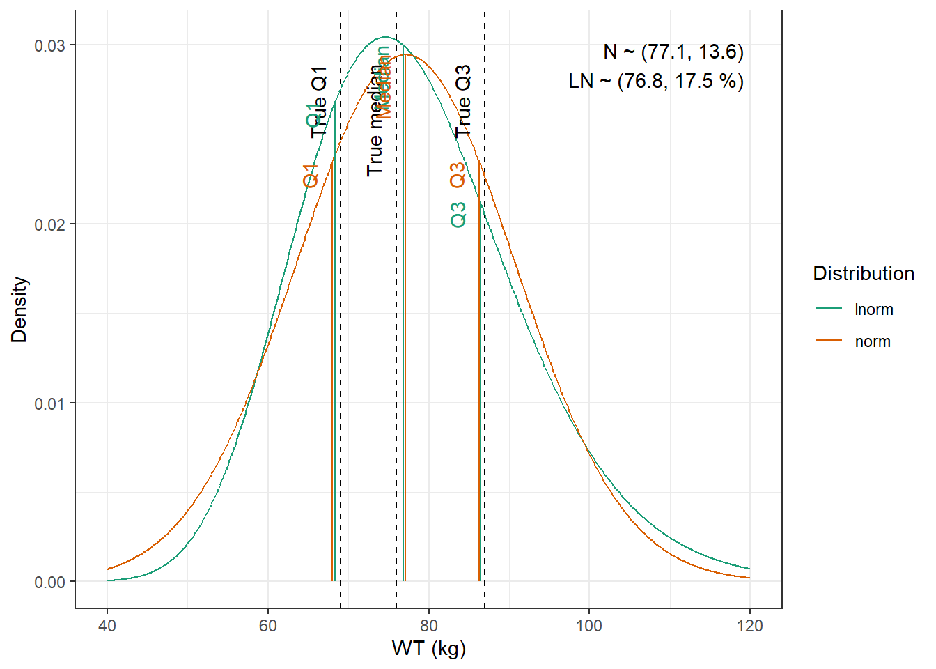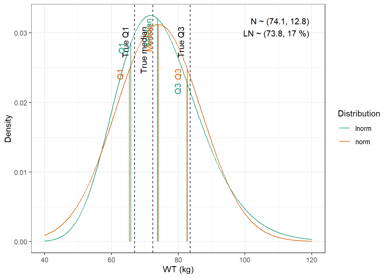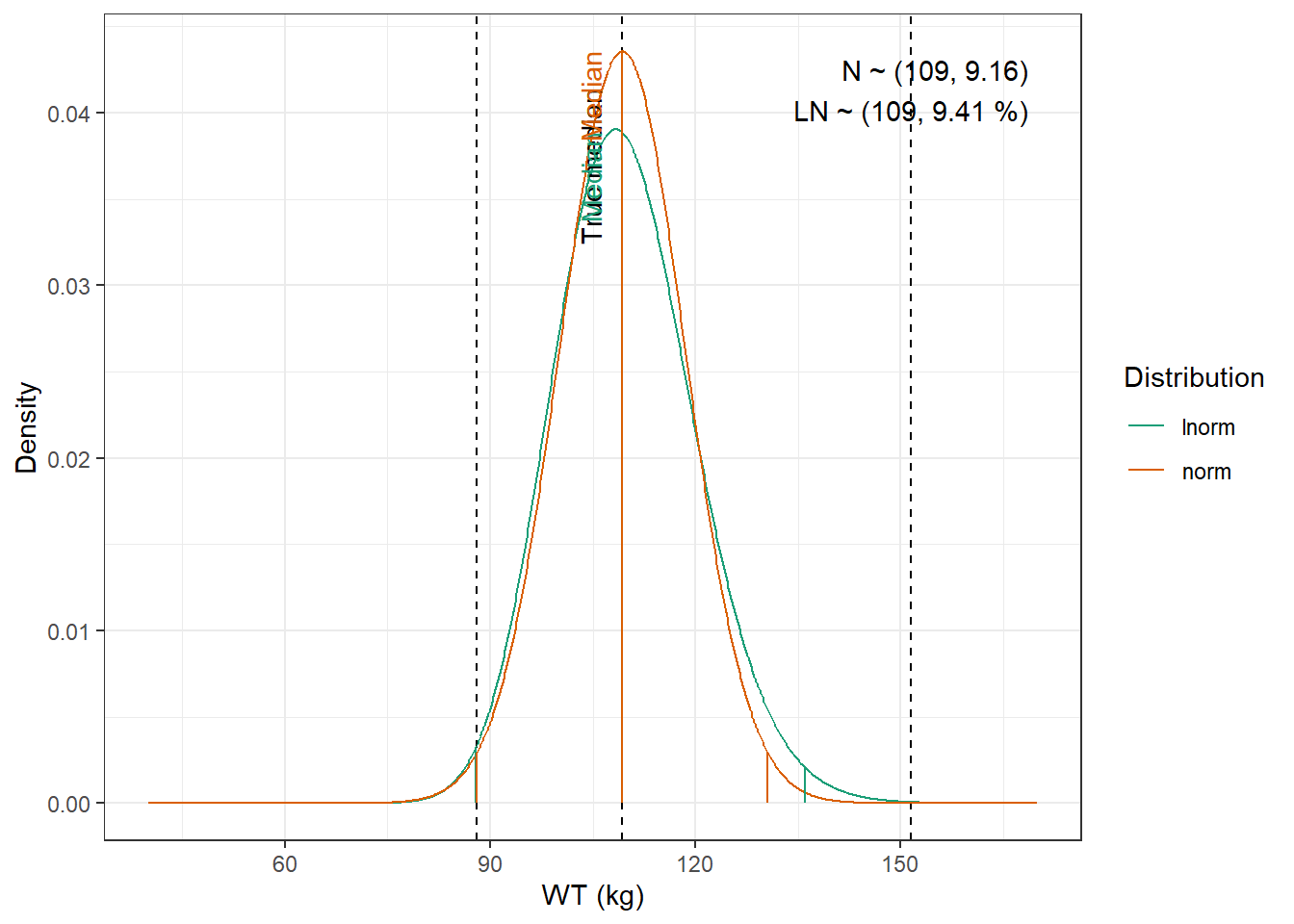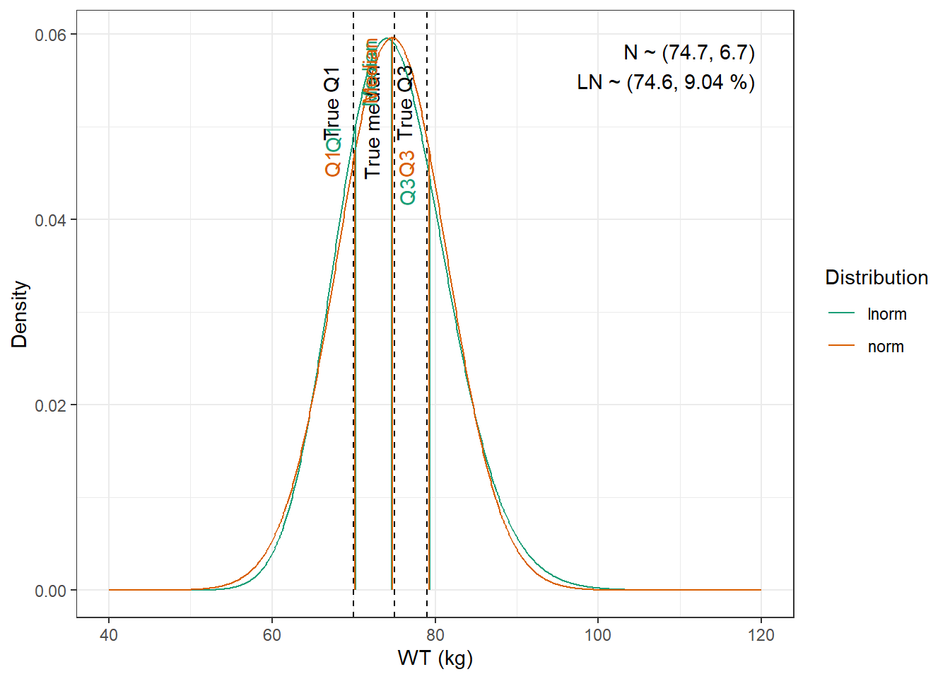 WT : Lognormal distribution with mean 74.6 kg, and coefficient of variation 9.04 %