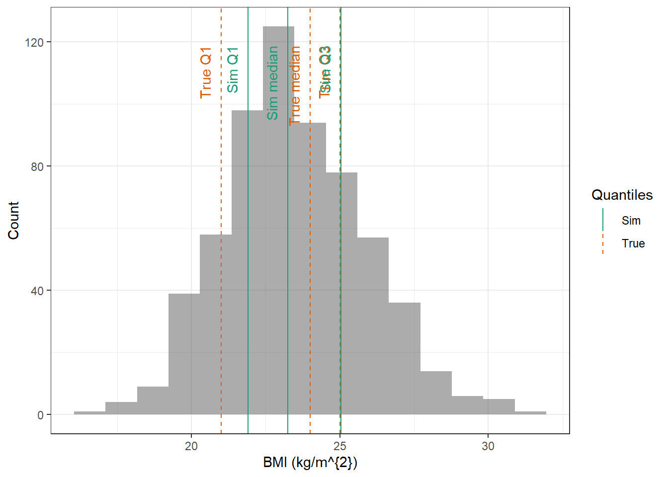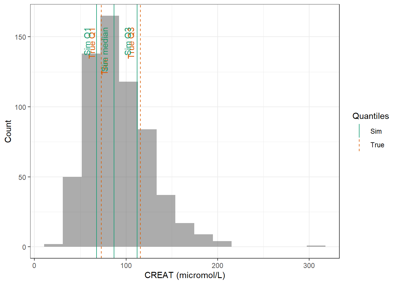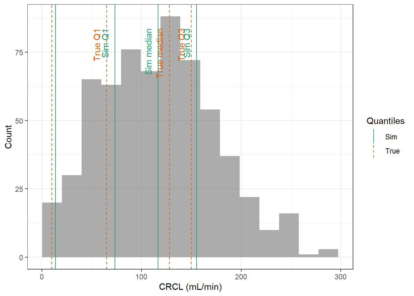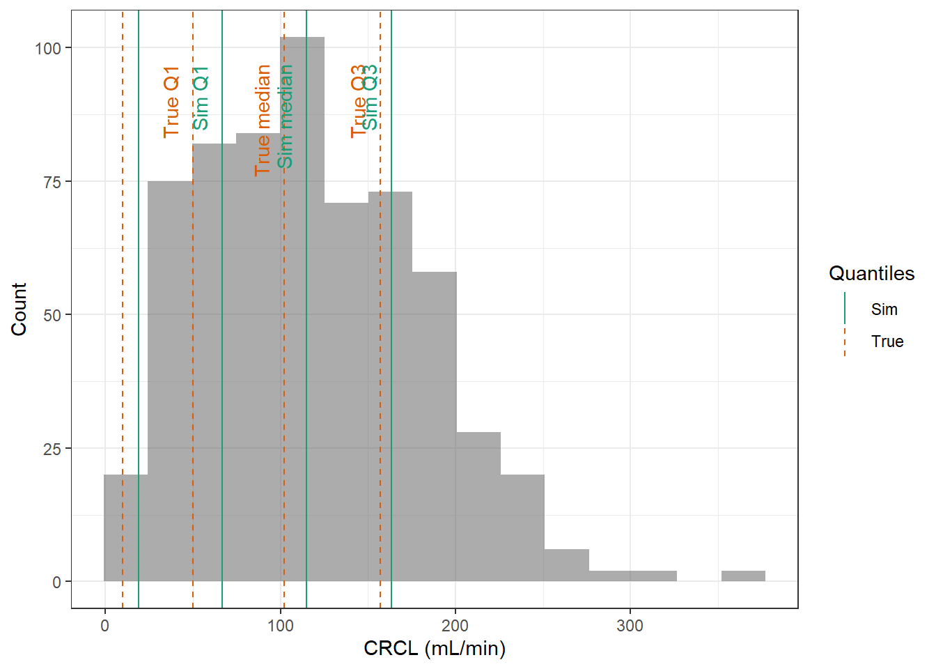 evaluate_cov_sim <-function(p, q, cov_name, cov_unit, cov_sim) {#' Plot simulated covariate distribution versus observed quantiles from the paper#' @param p numeric vector of probabilities#' @param q numeric vector of quantiles#' @param cov_name character string containing the covariate name#' @param cov_unit character string containing the unit of the covariate#' @param cov_sim tibble containing the simulated values for the covariate#' @return ggplot2 showing the distributions of the simulated covariate and the observed covariate quantiles#create a dataset with the true percentiles to be able to show them on the plot true_percentiles <-tibble(p, q) |>mutate(label =case_match(p, 0~"True min",0.25~"True Q1",0.5~"True median",0.75~"True Q3",1~"True max")) #create a dataset with the percentiles of the fitted distributions to be able to show them on the plot sim_percentiles <-tibble(probability = p,q =quantile(pull(cov_sim,cov_name),p) ) |>mutate(label =case_match(probability, 0~"Sim min",0.25~"Sim Q1",0.5~"Sim median",0.75~"Sim Q3",1~"Sim max"))# create an initial histogram in order to be able to extract statistics of the binned covariatehist_ini <-ggplot(cov_sim, aes(x = .data[[cov_name]])) +geom_histogram(bins=15)hist_data <-layer_data(hist_ini)plot <-ggplot(hist_data) +geom_rect(aes(xmin=xmin,xmax=xmax, ymin=0, ymax=count),alpha =0.5) +geom_vline(data = true_percentiles,mapping =aes(xintercept = q,color ="True"),lty ="dashed") +geom_vline(data = sim_percentiles,mapping =aes(xintercept = q,color ="Sim"),lty ="solid") +theme_bw() +ylab("Count") +xlab(paste0(cov_name, " (", cov_unit, ")")) +geom_text(data = true_percentiles,mapping =aes(x = q, label = label, color ="True"),show.legend =FALSE,y =0.95*max(hist_data$ymax),hjust =1,vjust =-1,angle =90 ) +geom_text(data = sim_percentiles,mapping =aes(x = q, label = label, color ="Sim"),show.legend =FALSE,y =0.95*max(hist_data$ymax),hjust =1,vjust =-1,angle =90 ) +scale_color_brewer(name ="Quantiles",palette ="Dark2") plot}plot_sim_cov_wrapper <-function(cov_data,cov_name,cov_sim){ cov_df <-extract_cov_param(cov_data, cov_name)evaluate_cov_sim(cov_df$p,cov_df$q,cov_df$cov_name,cov_df$cov_unit, cov_sim)}