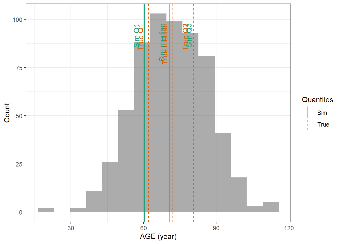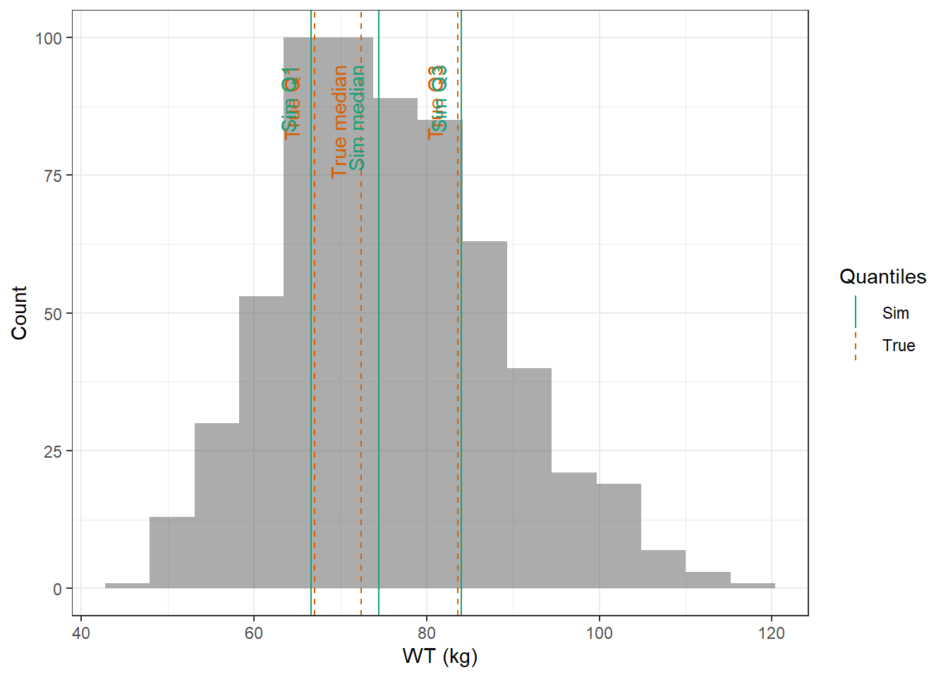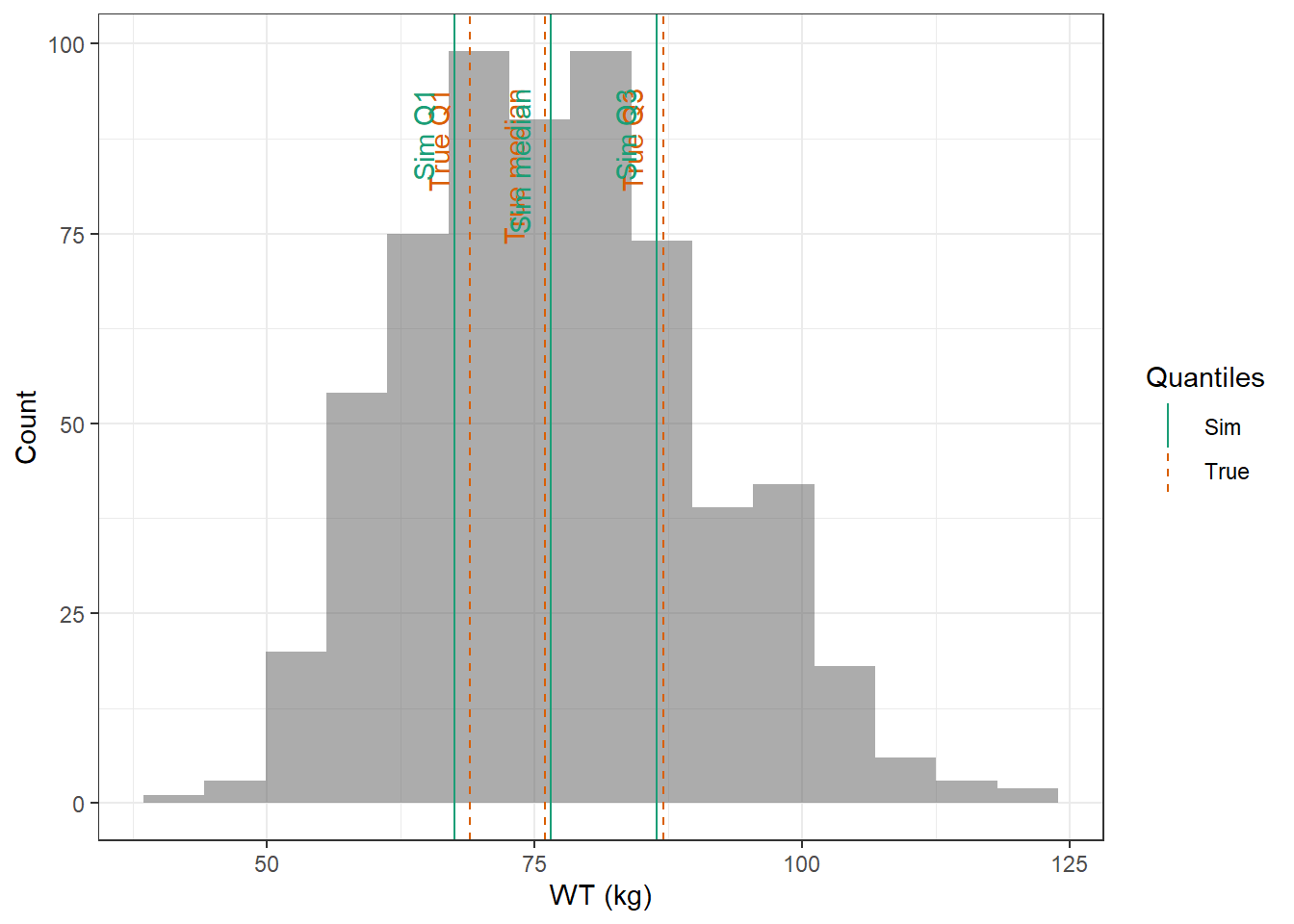 evaluate_cov_sim <-function(p, q, cov_name, cov_unit, cov_sim) {#' Plot simulated covariate distribution versus observed quantiles from the paper#' @param p numeric vector of probabilities#' @param q numeric vector of quantiles#' @param cov_name character string containing the covariate name#' @param cov_unit character string containing the unit of the covariate#' @param cov_sim tibble containing the simulated values for the covariate#' @return ggplot2 showing the distributions of the simulated covariate and the observed covariate quantiles#create a dataset with the true percentiles to be able to show them on the plot true_percentiles <-tibble(p, q) |>mutate(label =case_match(p, 0~"True min",0.25~"True Q1",0.5~"True median",0.75~"True Q3",1~"True max")) #create a dataset with the percentiles of the fitted distributions to be able to show them on the plot sim_percentiles <-tibble(probability = p,q =quantile(pull(cov_sim,cov_name),p) ) |>mutate(label =case_match(probability, 0~"Sim min",0.25~"Sim Q1",0.5~"Sim median",0.75~"Sim Q3",1~"Sim max"))# create an initial histogram in order to be able to extract statistics of the binned covariatehist_ini <-ggplot(cov_sim, aes(x = .data[[cov_name]])) +geom_histogram(bins=15)hist_data <-layer_data(hist_ini)plot <-ggplot(hist_data) +geom_rect(aes(xmin=xmin,xmax=xmax, ymin=0, ymax=count),alpha =0.5) +geom_vline(data = true_percentiles,mapping =aes(xintercept = q,color ="True"),lty ="dashed") +geom_vline(data = sim_percentiles,mapping =aes(xintercept = q,color ="Sim"),lty ="solid") +theme_bw() +ylab("Count") +xlab(paste0(cov_name, " (", cov_unit, ")")) +geom_text(data = true_percentiles,mapping =aes(x = q, label = label, color ="True"),show.legend =FALSE,y =0.95*max(hist_data$ymax),hjust =1,vjust =-1,angle =90 ) +geom_text(data = sim_percentiles,mapping =aes(x = q, label = label, color ="Sim"),show.legend =FALSE,y =0.95*max(hist_data$ymax),hjust =1,vjust =-1,angle =90 ) +scale_color_brewer(name ="Quantiles",palette ="Dark2") plot}plot_sim_cov_wrapper <-function(cov_data,cov_name,cov_sim){ cov_df <-extract_cov_param(cov_data, cov_name)evaluate_cov_sim(cov_df$p,cov_df$q,cov_df$cov_name,cov_df$cov_unit, cov_sim)}