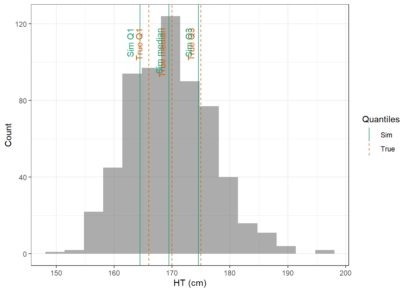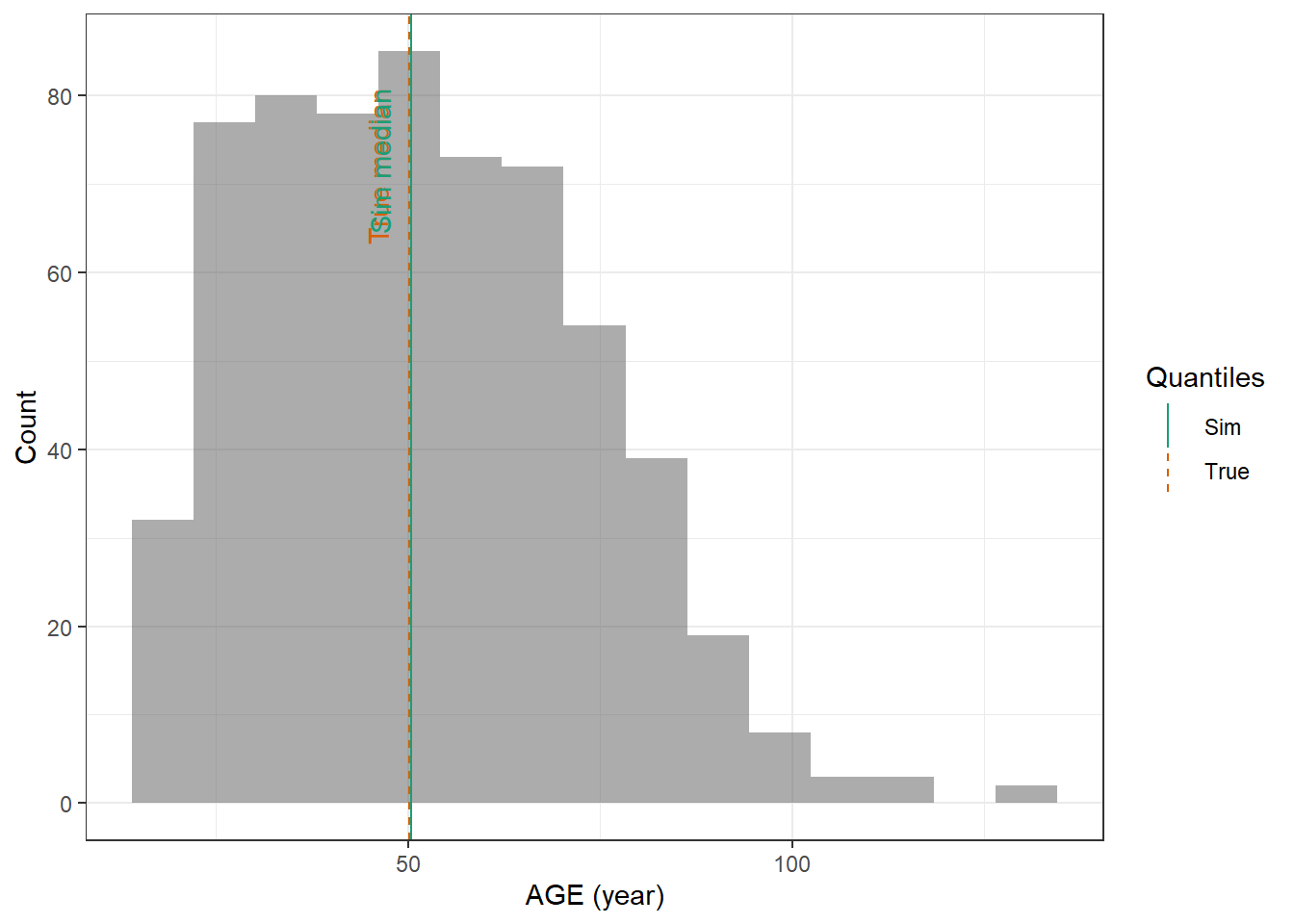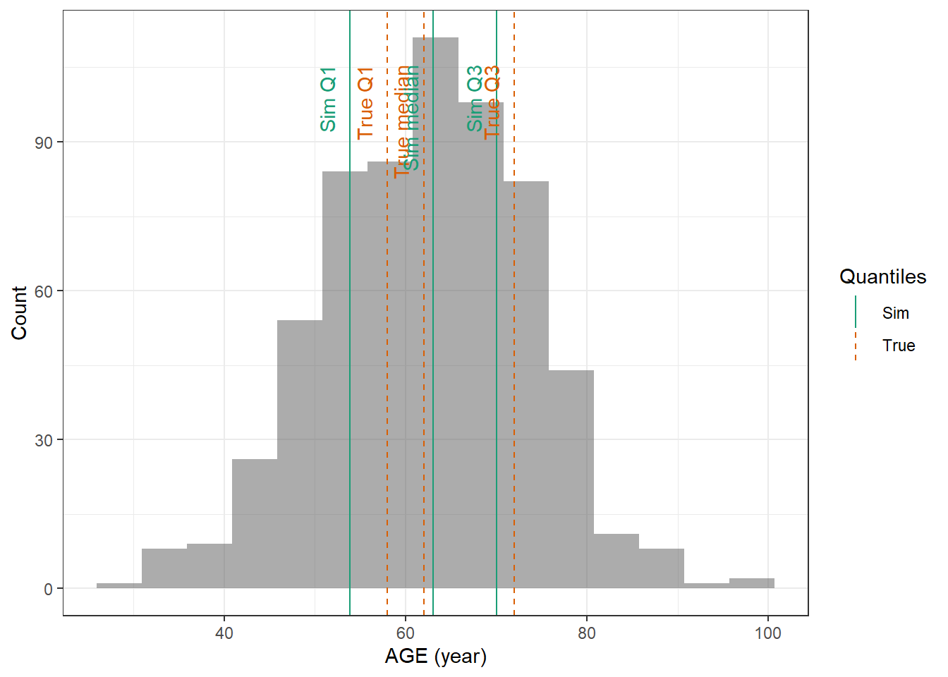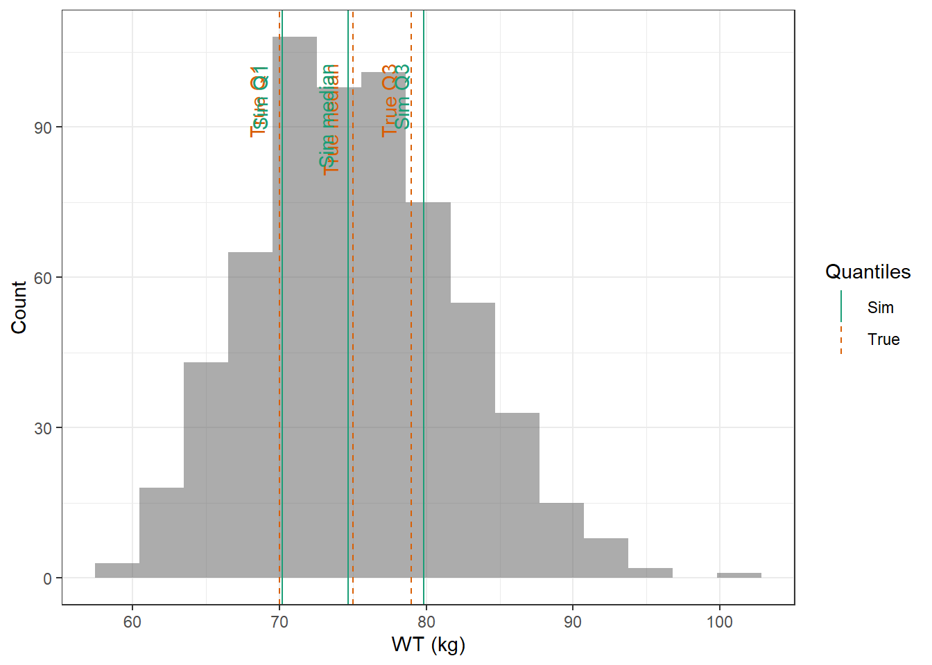 evaluate_cov_sim <-function(p, q, cov_name, cov_unit, cov_sim) {#' Plot simulated covariate distribution versus observed quantiles from the paper#' @param p numeric vector of probabilities#' @param q numeric vector of quantiles#' @param cov_name character string containing the covariate name#' @param cov_unit character string containing the unit of the covariate#' @param cov_sim tibble containing the simulated values for the covariate#' @return ggplot2 showing the distributions of the simulated covariate and the observed covariate quantiles#create a dataset with the true percentiles to be able to show them on the plot true_percentiles <-tibble(p, q) |>mutate(label =case_match(p, 0~"True min",0.25~"True Q1",0.5~"True median",0.75~"True Q3",1~"True max")) #create a dataset with the percentiles of the fitted distributions to be able to show them on the plot sim_percentiles <-tibble(probability = p,q =quantile(pull(cov_sim,cov_name),p) ) |>mutate(label =case_match(probability, 0~"Sim min",0.25~"Sim Q1",0.5~"Sim median",0.75~"Sim Q3",1~"Sim max"))# create an initial histogram in order to be able to extract statistics of the binned covariatehist_ini <-ggplot(cov_sim, aes(x = .data[[cov_name]])) +geom_histogram(bins=15)hist_data <-layer_data(hist_ini)plot <-ggplot(hist_data) +geom_rect(aes(xmin=xmin,xmax=xmax, ymin=0, ymax=count),alpha =0.5) +geom_vline(data = true_percentiles,mapping =aes(xintercept = q,color ="True"),lty ="dashed") +geom_vline(data = sim_percentiles,mapping =aes(xintercept = q,color ="Sim"),lty ="solid") +theme_bw() +ylab("Count") +xlab(paste0(cov_name, " (", cov_unit, ")")) +geom_text(data = true_percentiles,mapping =aes(x = q, label = label, color ="True"),show.legend =FALSE,y =0.95*max(hist_data$ymax),hjust =1,vjust =-1,angle =90 ) +geom_text(data = sim_percentiles,mapping =aes(x = q, label = label, color ="Sim"),show.legend =FALSE,y =0.95*max(hist_data$ymax),hjust =1,vjust =-1,angle =90 ) +scale_color_brewer(name ="Quantiles",palette ="Dark2") plot}plot_sim_cov_wrapper <-function(cov_data,cov_name,cov_sim){ cov_df <-extract_cov_param(cov_data, cov_name)evaluate_cov_sim(cov_df$p,cov_df$q,cov_df$cov_name,cov_df$cov_unit, cov_sim)}