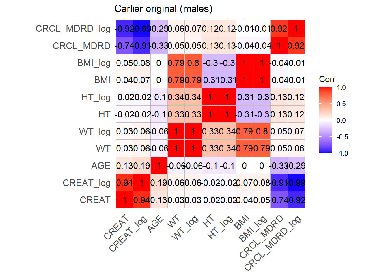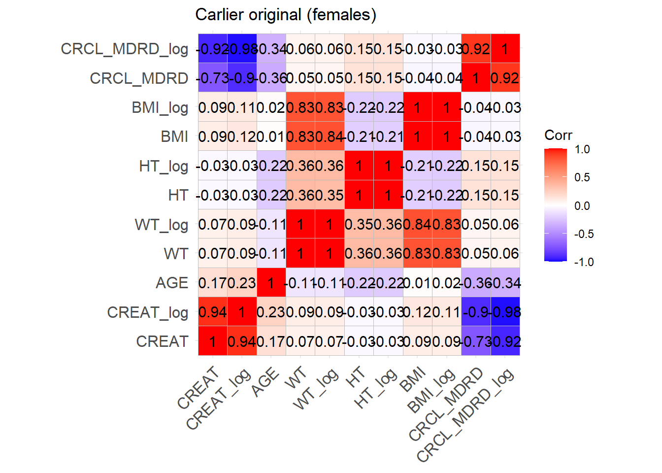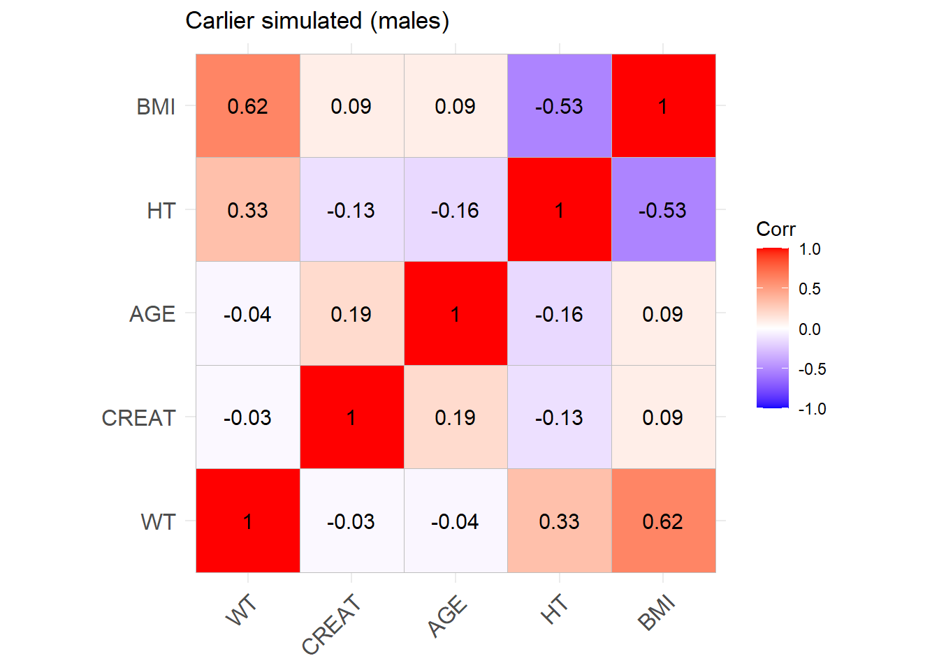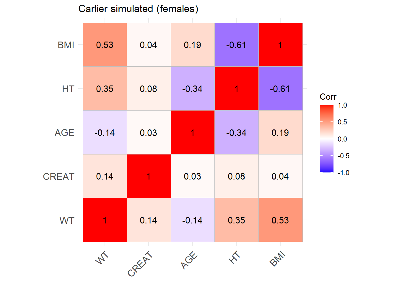 reconvert_MDRD <-function(AGE, CRCL, SEX) {# Mutliply by 0.742 for females sex_factor <-ifelse(SEX ==0, 1, 0.742)# Calculate DFG CREAT <- (CRCL / (175* (AGE^(-0.203)) * sex_factor))^(-1/1.154)return(CREAT)}sim_cov_carlier <- sim_cov_carlier %>%mutate(BSA = (WT^0.425* (HT^0.725) *0.007184), # Calculate body surface area based on Dubois&Dubois formulaCRCL = CRCL * (1.73/BSA) # convert mL/min to mL/min/1.73 m2 )sim_cov_carlier$CREAT <-mapply(reconvert_MDRD, sim_cov_carlier$AGE, sim_cov_carlier$CRCL, sim_cov_carlier$SEX)sim_cov_carlier <- sim_cov_carlier %>% dplyr::select(Paper, ID_within_paper, ICU, BURN, OBESE, CREAT, WT, BSA, BMI, AGE, SEX, HT)# Calculate the simulated correlation matrices separately for the two sexes to compare with the originalsim_cov_carlier_M <- sim_cov_carlier %>%filter(SEX ==0)sim_cov_carlier_F <- sim_cov_carlier %>%filter(SEX ==1)cor_sim_M <-cor(sim_cov_carlier_M %>% dplyr::select(WT, CREAT, AGE, HT, BMI), use ="complete.obs")cor_sim_F <-cor(sim_cov_carlier_F %>% dplyr::select(WT, CREAT, AGE, HT, BMI), use ="complete.obs")ggcorrplot(cor_matrix_Carlier_F, lab =TRUE, title ="Carlier original (females)")