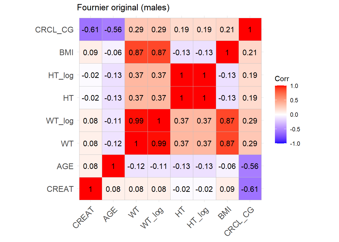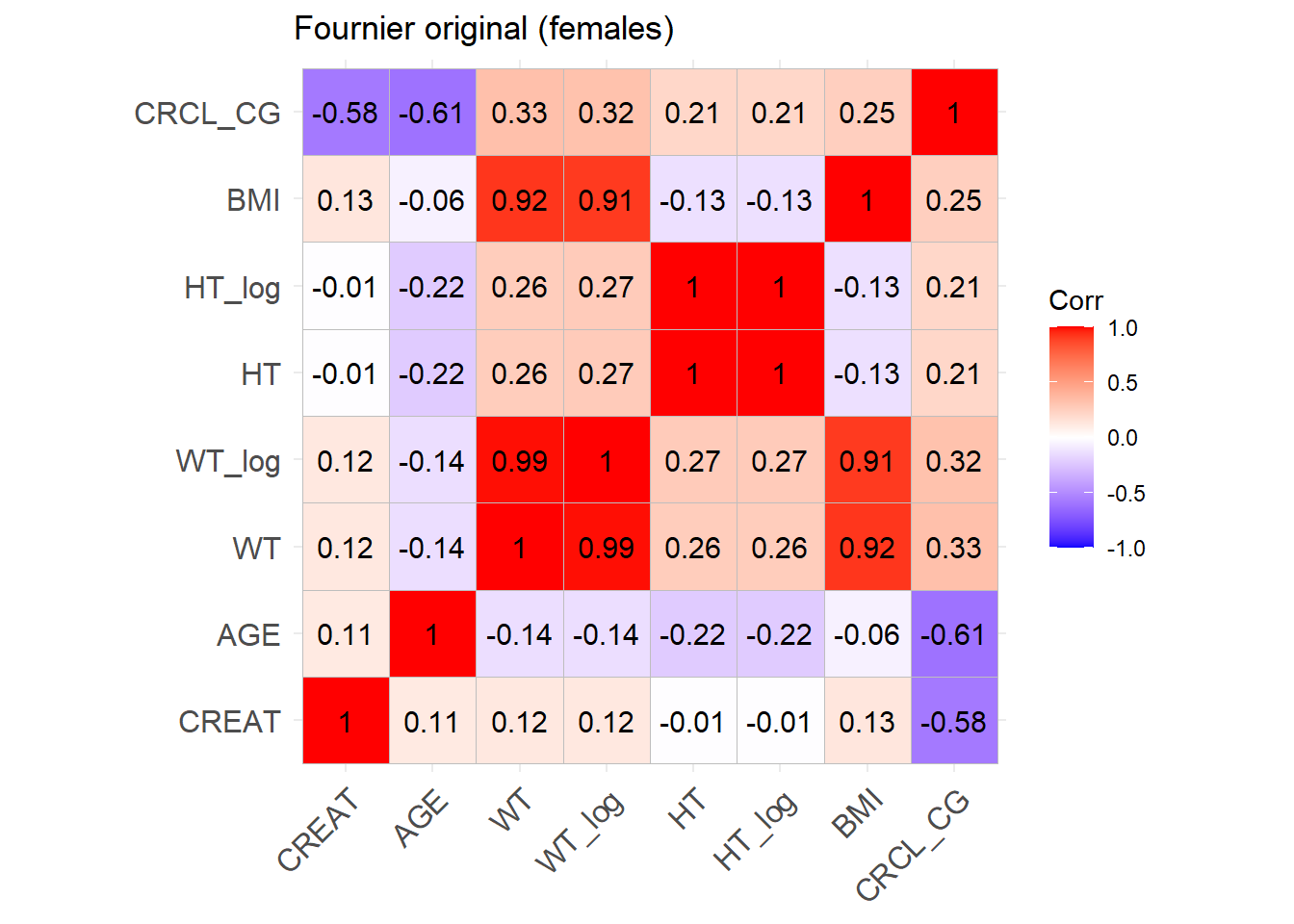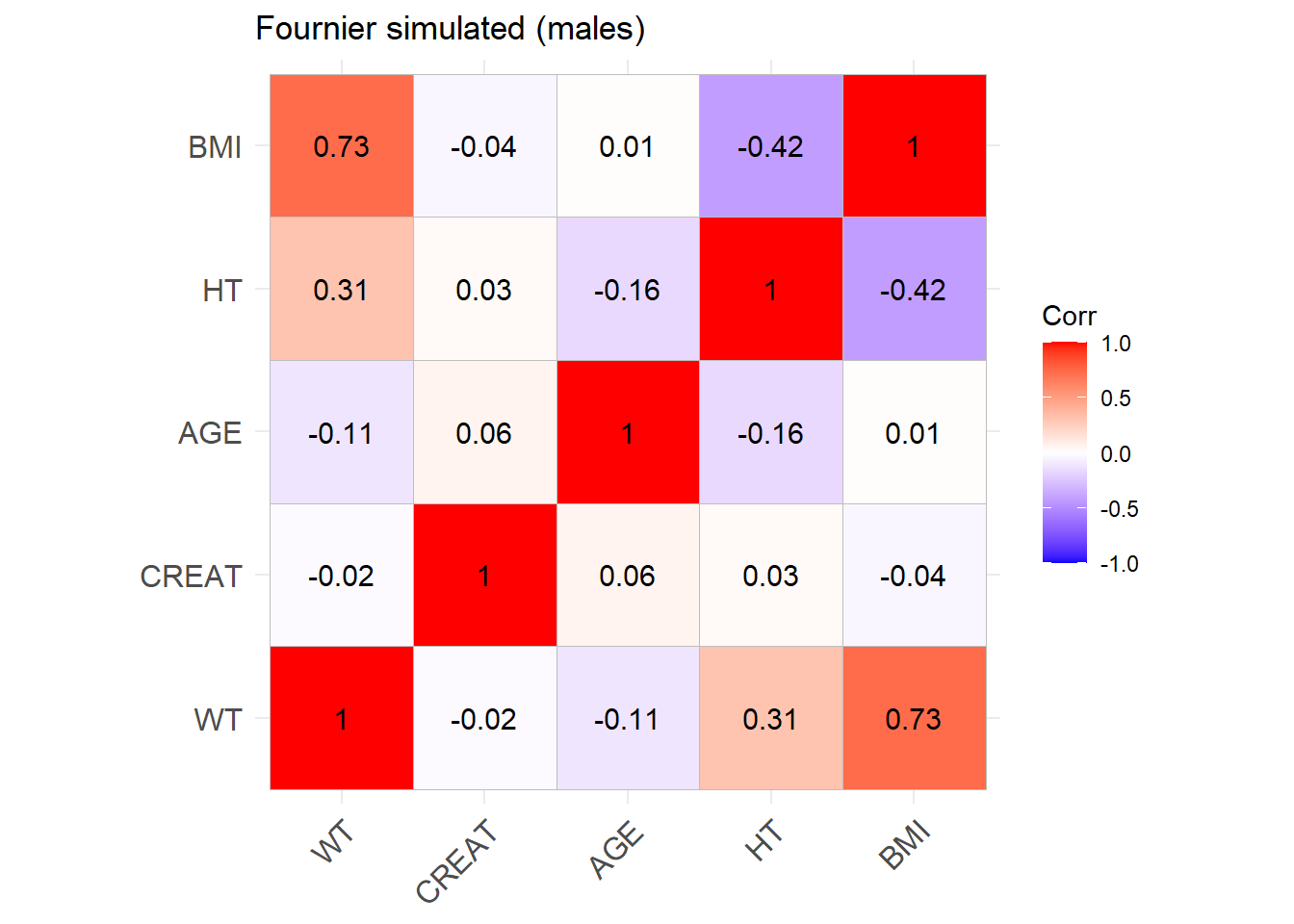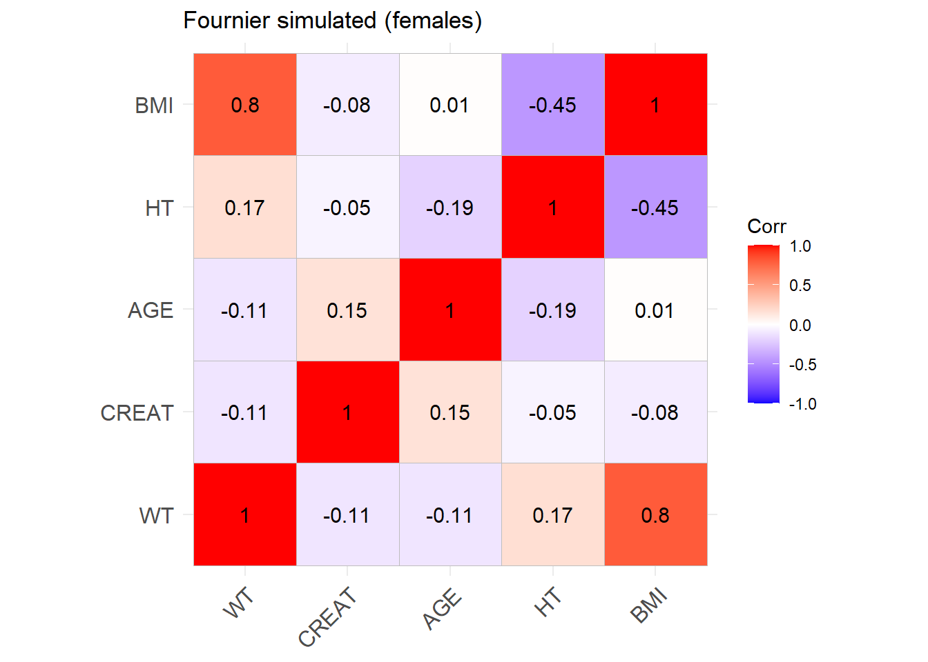 reconvert_CG <-function(AGE, CRCL, SEX, WT) {# Mutliply by 0.85 for females sex_factor <-ifelse(SEX ==0, 1, 0.85)# Calculate DFG CREAT = ((140- AGE) * WT * sex_factor) / (CRCL *72)return(CREAT)}sim_cov_fournier$CREAT <-mapply(reconvert_CG, sim_cov_fournier$AGE, sim_cov_fournier$CRCL, sim_cov_fournier$SEX, sim_cov_fournier$WT)sim_cov_fournier <- sim_cov_fournier %>%mutate(BSA = (WT^0.425* (HT^0.725) *0.007184),BMI = WT / (HT/100)^2,OBESE =ifelse(BMI >30, 1, 0) ) %>% dplyr::select(Paper, ID_within_paper, ICU, BURN, OBESE, CREAT, WT, BSA, BMI, AGE, SEX, HT)# Calculate the simulated correlation matrices separately for the two sexes to compare with the originalsim_cov_fournier_M <- sim_cov_fournier %>%filter(SEX ==0)sim_cov_fournier_F <- sim_cov_fournier %>%filter(SEX ==1)cor_sim_M <-cor(sim_cov_fournier_M %>% dplyr::select(WT, CREAT, AGE, HT, BMI), use ="complete.obs")cor_sim_F <-cor(sim_cov_fournier_F %>% dplyr::select(WT, CREAT, AGE, HT, BMI), use ="complete.obs")ggcorrplot(cor_matrix_Fournier_F, lab =TRUE, title ="Fournier original (females)")