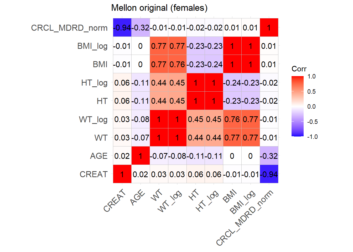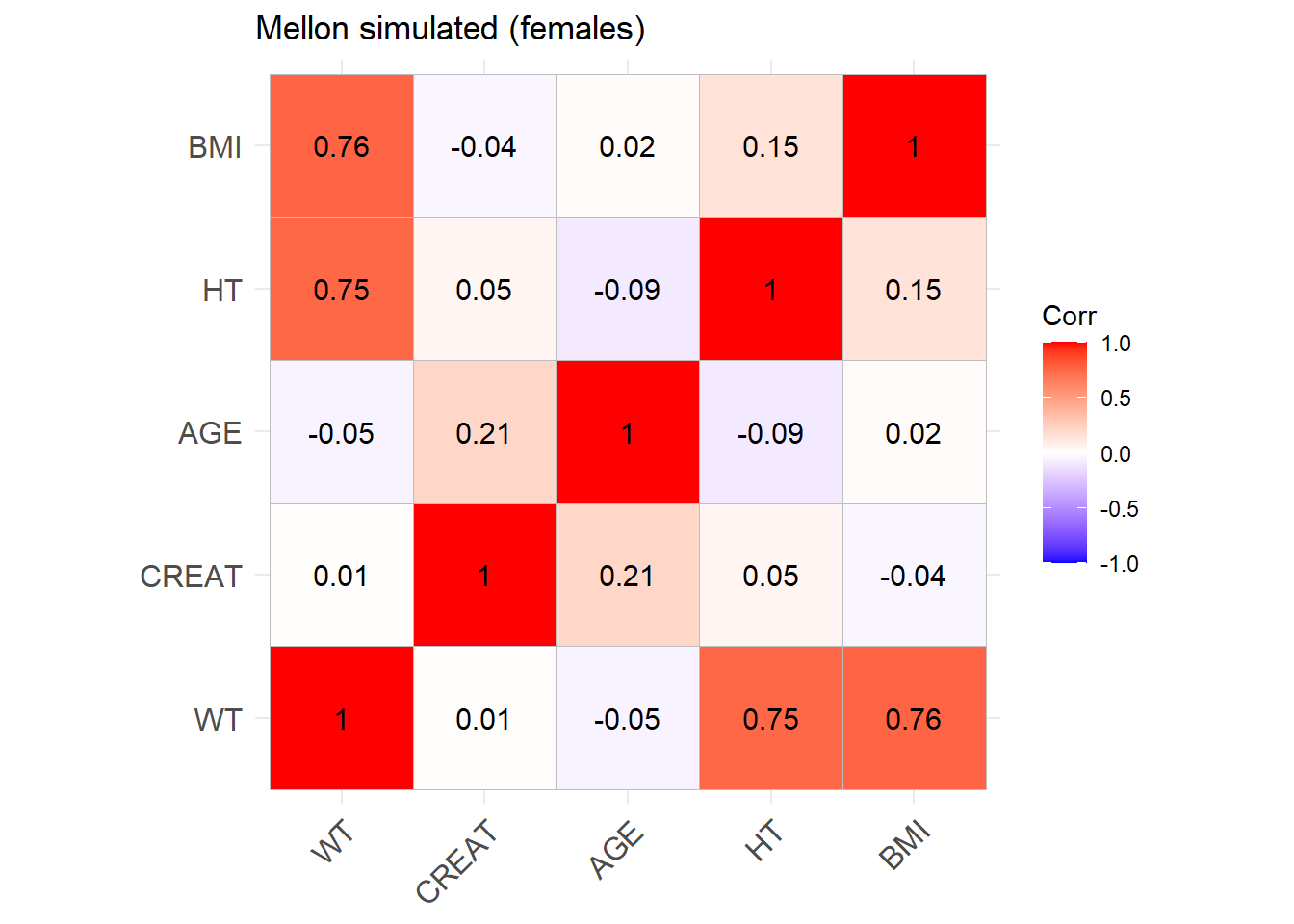 reconvert_MDRD <-function(AGE, CRCL, SEX) {# Mutliply by 0.85 for females sex_factor <-ifelse(SEX ==0, 1, 0.742)# Calculate DFG CREAT <- (CRCL / (175* (AGE^(-0.203)) * sex_factor))^(-1/1.154)return(CREAT)}sim_cov_mellon$CREAT <-mapply(reconvert_MDRD, sim_cov_mellon$AGE, sim_cov_mellon$CRCL, sim_cov_mellon$SEX)sim_cov_mellon <- sim_cov_mellon %>%mutate(HT =sqrt(WT/BMI) *100, # mutliplied by 100 to convert m to cmBSA = (WT^0.425* (HT^0.725) *0.007184),OBESE =ifelse(BMI >30, 1, 0) ) %>% dplyr::select(Paper, ID_within_paper, ICU, BURN, OBESE, CREAT, WT, BSA, BMI, AGE, SEX, HT)# Calculate the simulated correlation matrices separately for the two sexes to compare with the originalsim_cov_mellon_M <- sim_cov_mellon %>%filter(SEX ==0)sim_cov_mellon_F <- sim_cov_mellon %>%filter(SEX ==1)cor_sim_M <-cor(sim_cov_mellon_M %>% dplyr::select(WT, CREAT, AGE, HT, BMI), use ="complete.obs")cor_sim_F <-cor(sim_cov_mellon_F %>% dplyr::select(WT, CREAT, AGE, HT, BMI), use ="complete.obs")ggcorrplot(cor_matrix_Mellon_F, lab =TRUE, title ="Mellon original (females)")