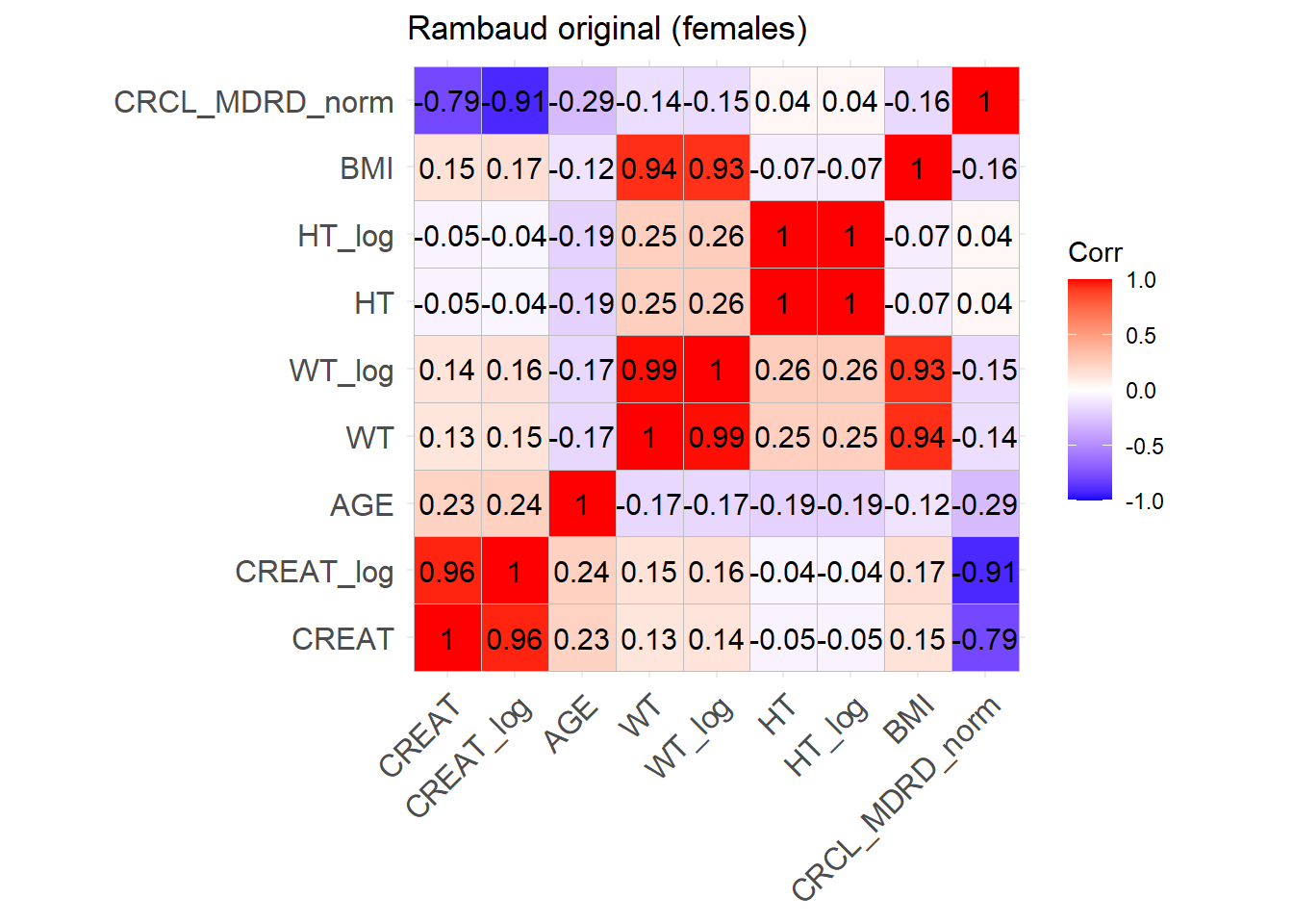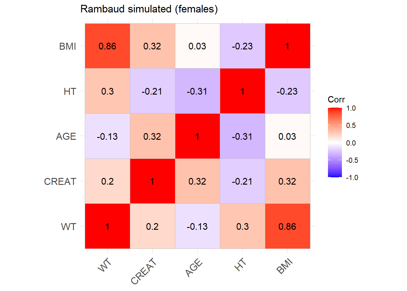 sim_cov_rambaud <- sim_cov_rambaud %>%mutate(BSA = (WT^0.425* (HT^0.725) *0.007184),CREAT = CREAT/88.4,BMI = WT / (HT/100)^2,OBESE =ifelse(BMI >30, 1, 0) ) %>% dplyr::select(Paper, ID_within_paper, ICU, BURN, OBESE, CREAT, WT, BSA, BMI, AGE, SEX, HT)# Calculate the simulated correlation matrices separately for the two sexes to compare with the originalsim_cov_rambaud_M <- sim_cov_rambaud %>%filter(SEX ==0)sim_cov_rambaud_F <- sim_cov_rambaud %>%filter(SEX ==1)cor_sim_M <-cor(sim_cov_rambaud_M %>% dplyr::select(WT, CREAT, AGE, HT, BMI), use ="complete.obs")cor_sim_F <-cor(sim_cov_rambaud_F %>% dplyr::select(WT, CREAT, AGE, HT, BMI), use ="complete.obs")ggcorrplot(cor_matrix_Rambaud_F, lab =TRUE, title ="Rambaud original (females)")